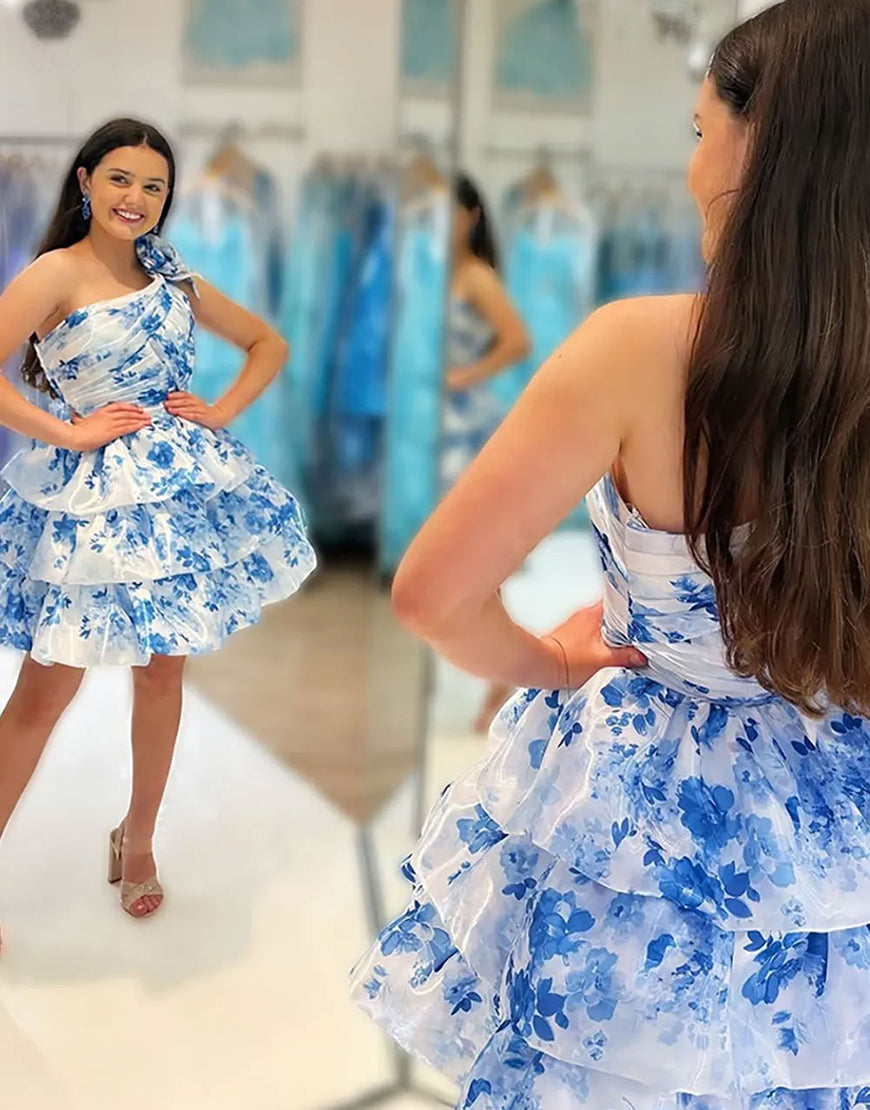 Blue Floral A Line One Shoulder Short Ruffled Homecoming Dress
