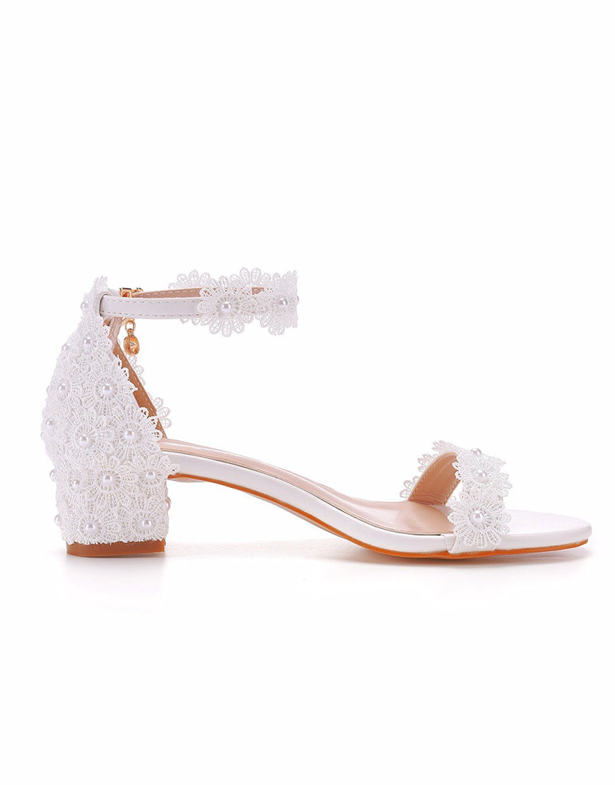 White Lace Block Heel Wedding Shoes with Pearls