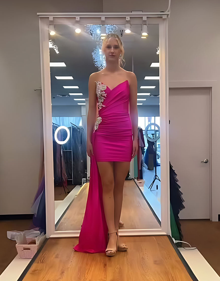 Fuchsia Sweetheart Ruched Short Satin Homecoming Dress with Side Cape