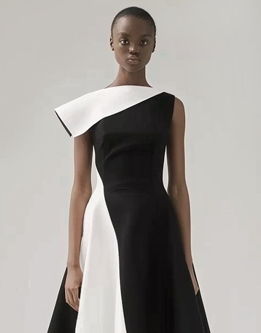 Black and White One Shoulder A Line Midi Cocktail Dress