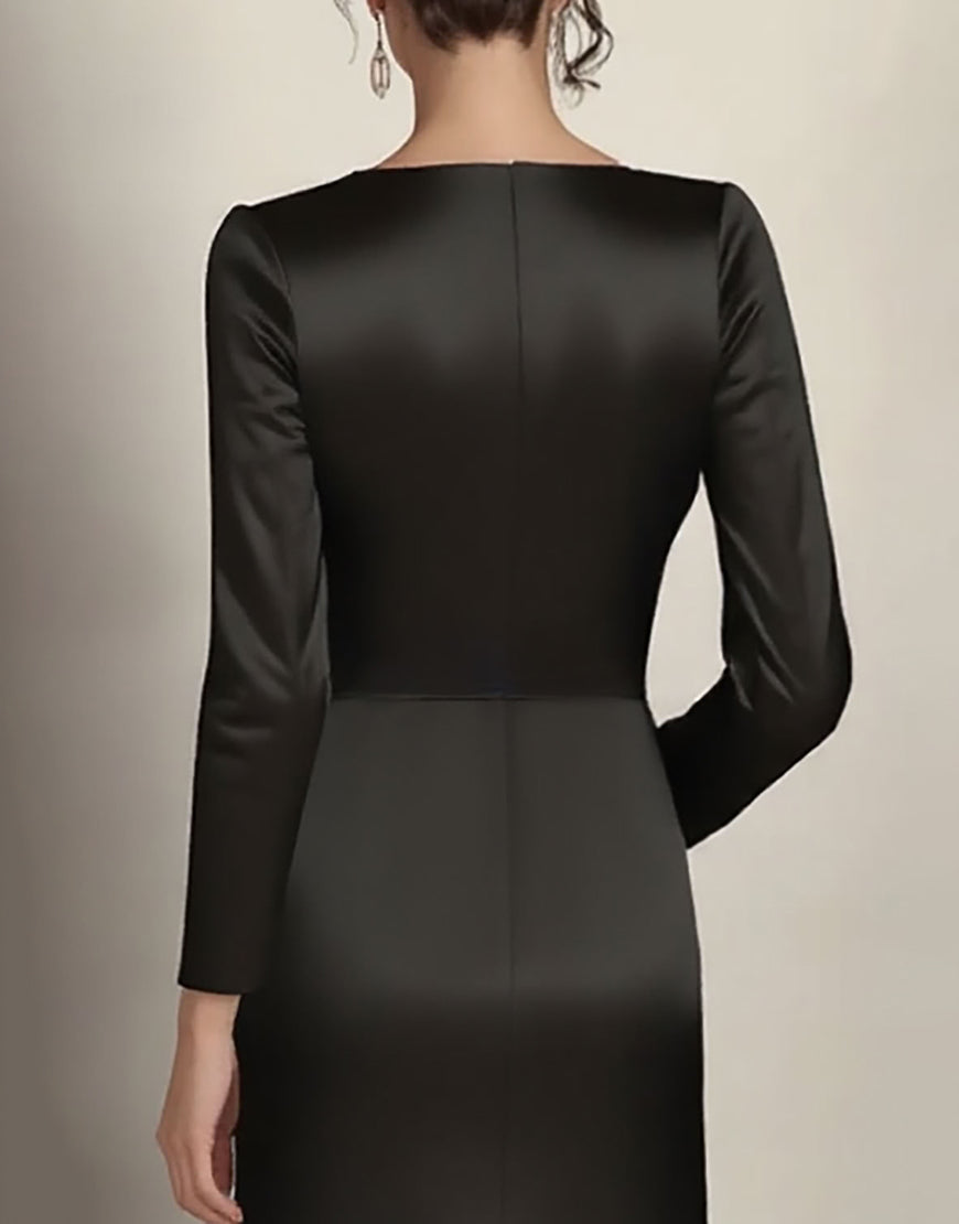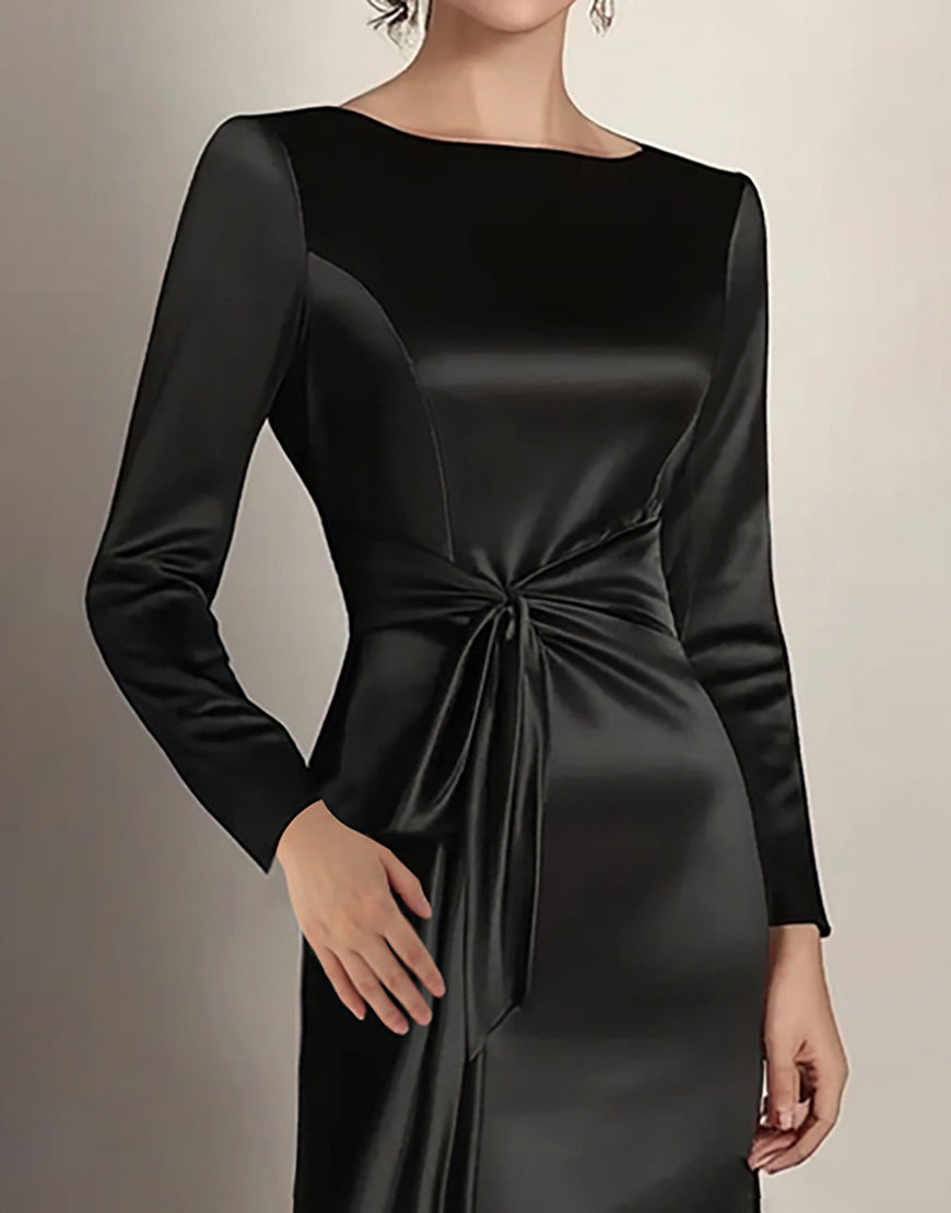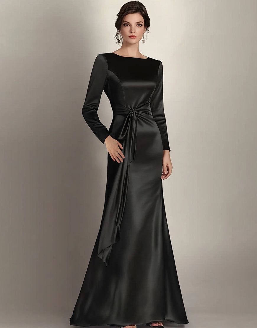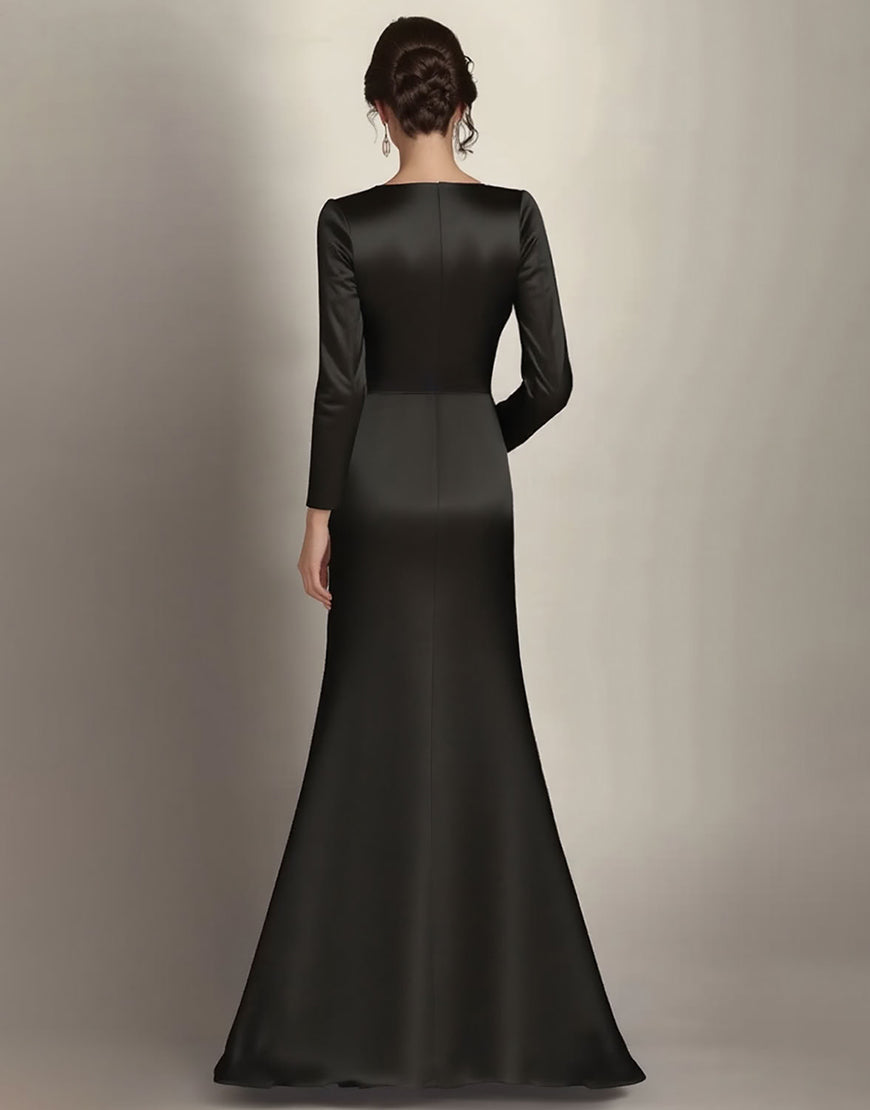 Black Mermaid Long Sleeves Satin Ruched Long Mother of the Bride Dress