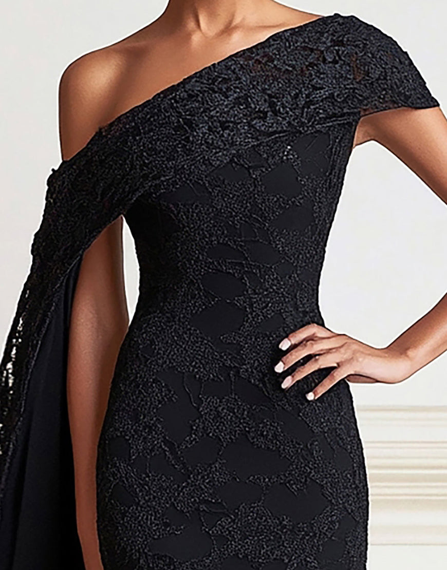 Black Mermaid One Shoulder Lace Long Mother of the Bride Dress with Side Shoulder Cape