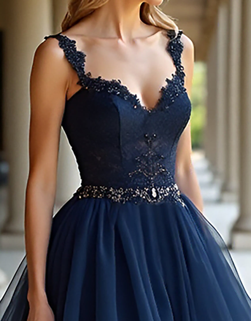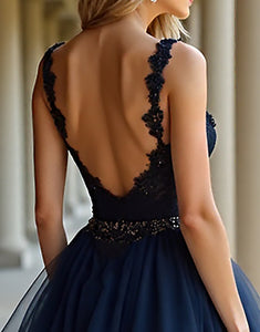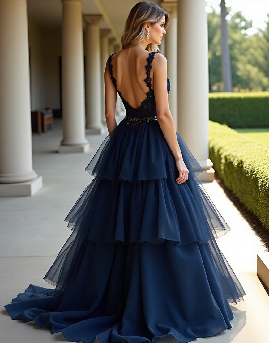 Design: This Navy A-Line Prom Dress features a sleeveless and backless design with cascading ruffles, adding a touch of elegance to the overall A-line silhouette. The lace applique and tulle fabric give a feminine and delicate look. The sweep train adds a dramatic effect, perfect for prom or any special occasion.