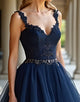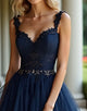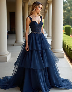 Navy A-Line Lace Applique Tulle Cascading Ruffles Prom Dress