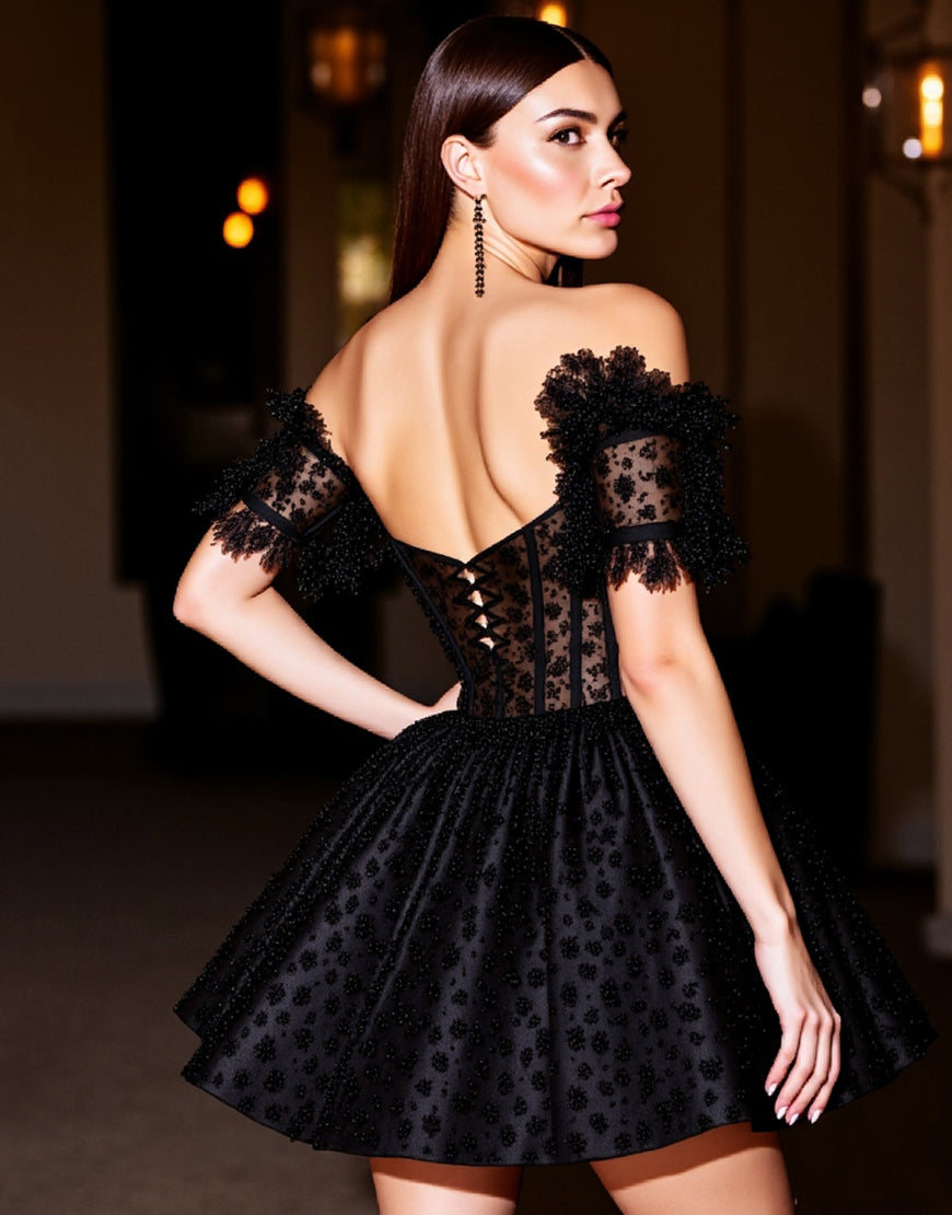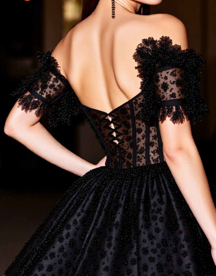 Off The Shoulder Black Appliqued A Line Homecoming Dress