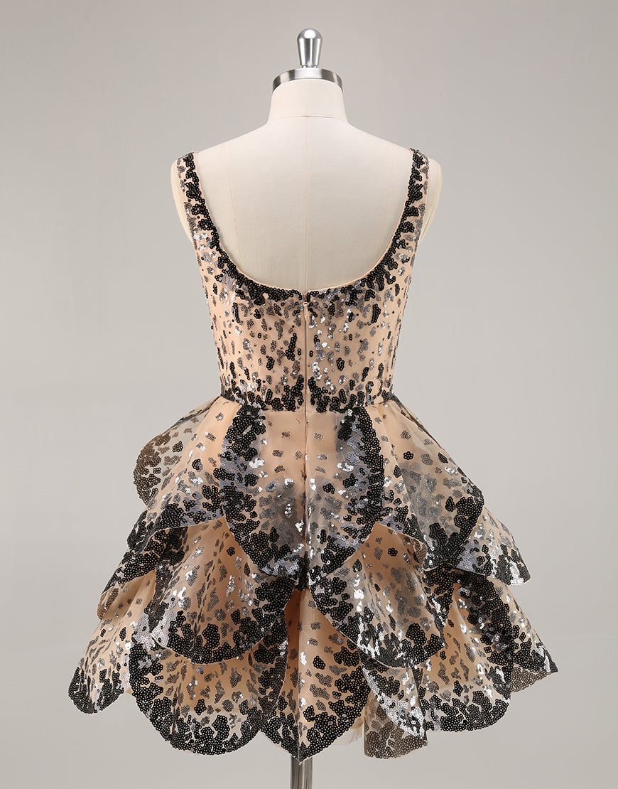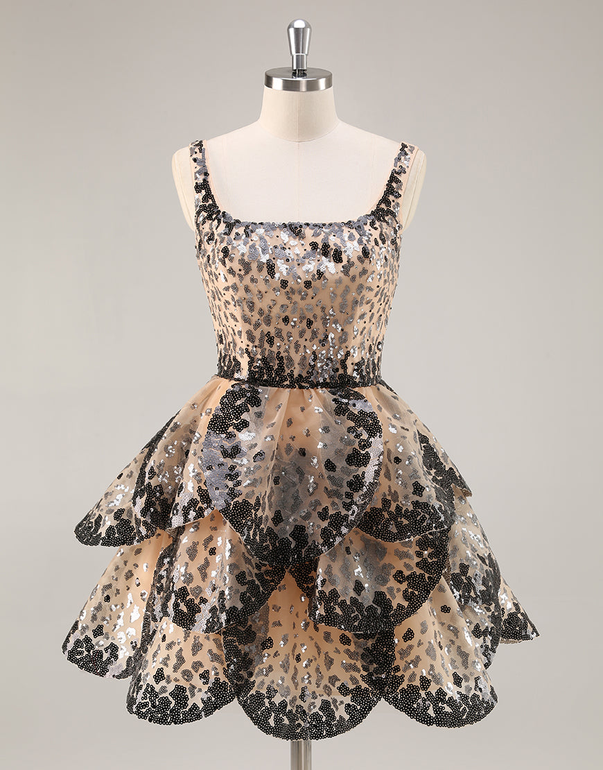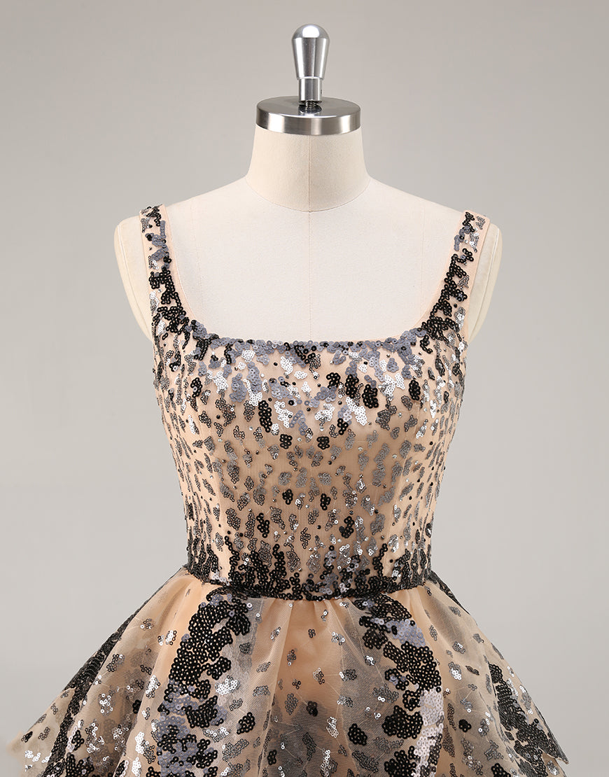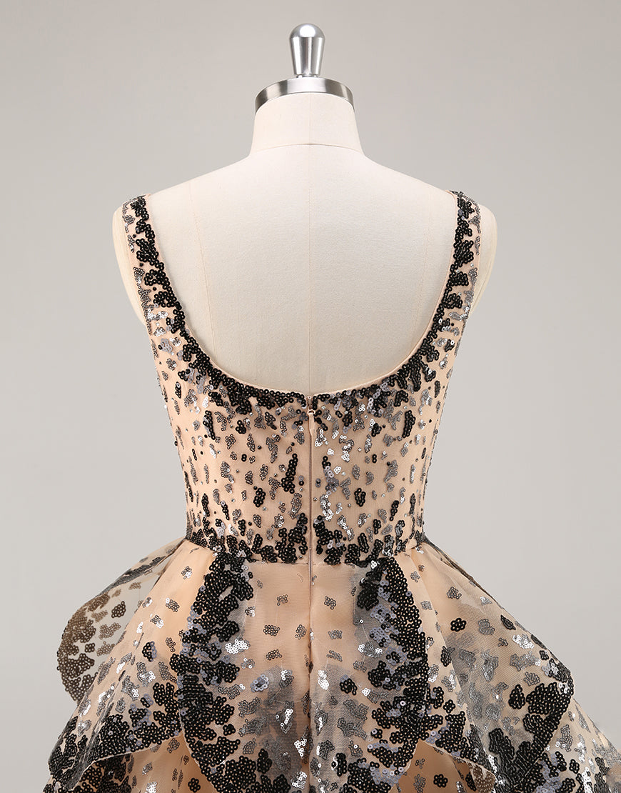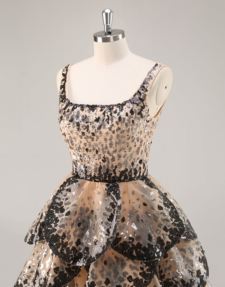 Sequin Tiered Black Apricot A Line Homecoming Dress