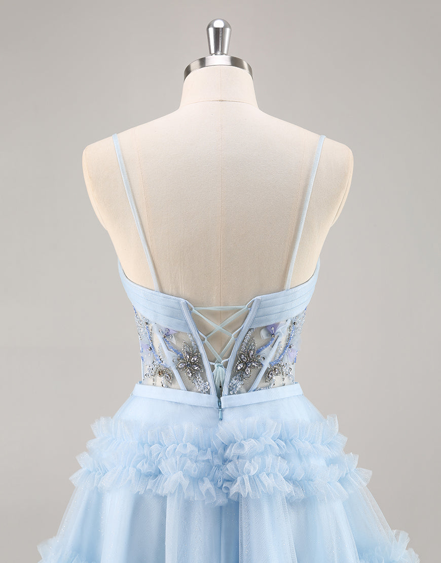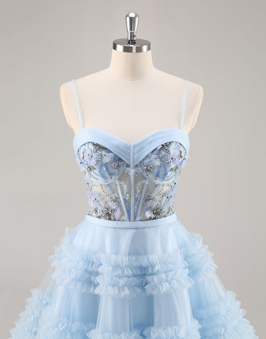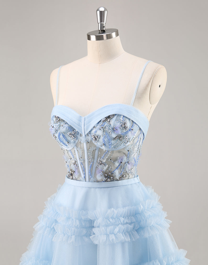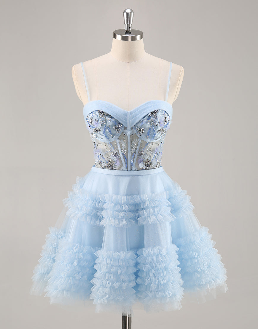 Blue Corset Ruffled Homecoming Dress with Appliques