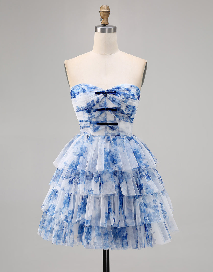 Strapless Tiered White Blue Flower Homecoming Dress with Lace Up Back