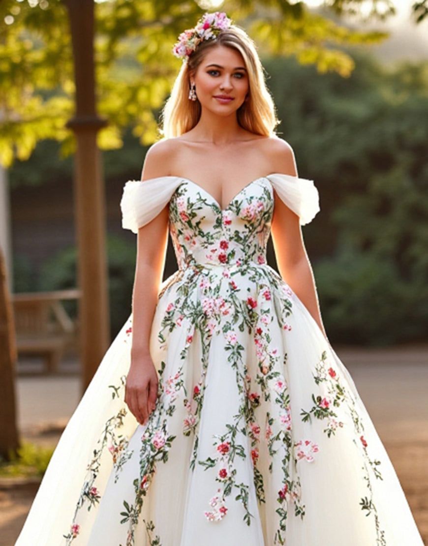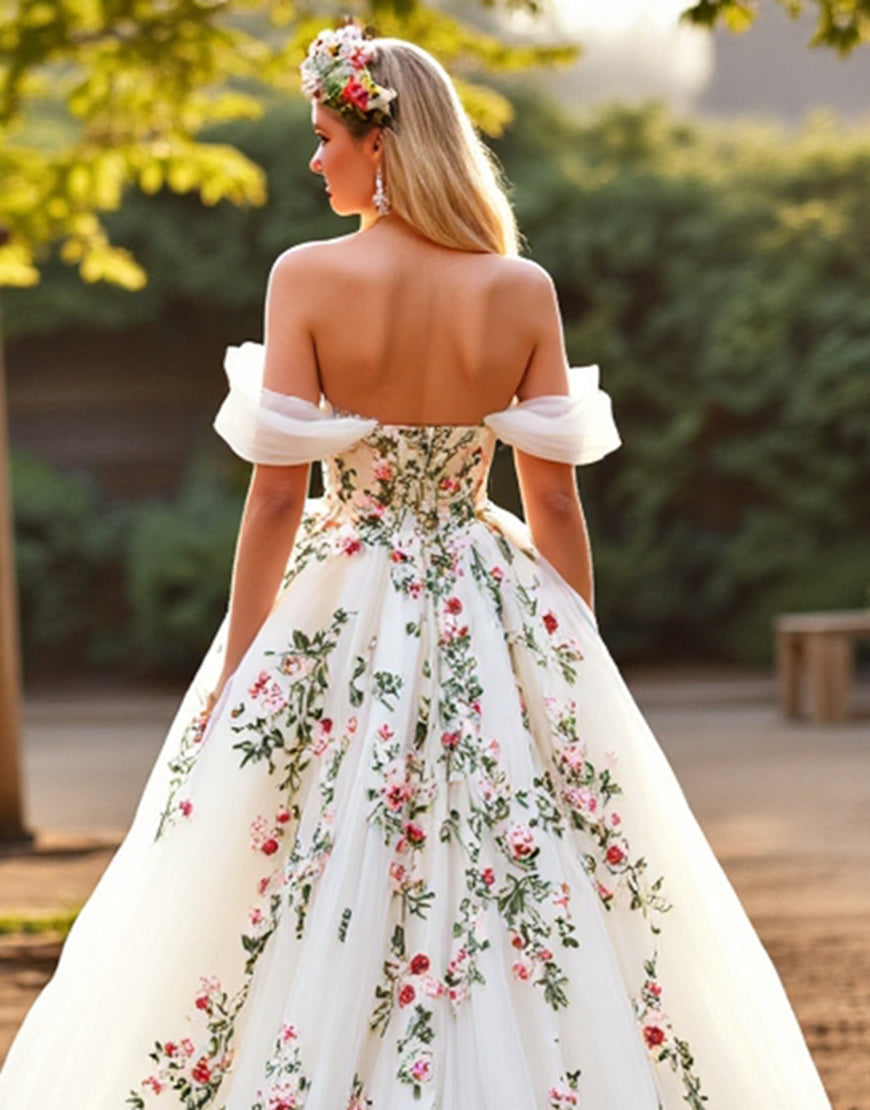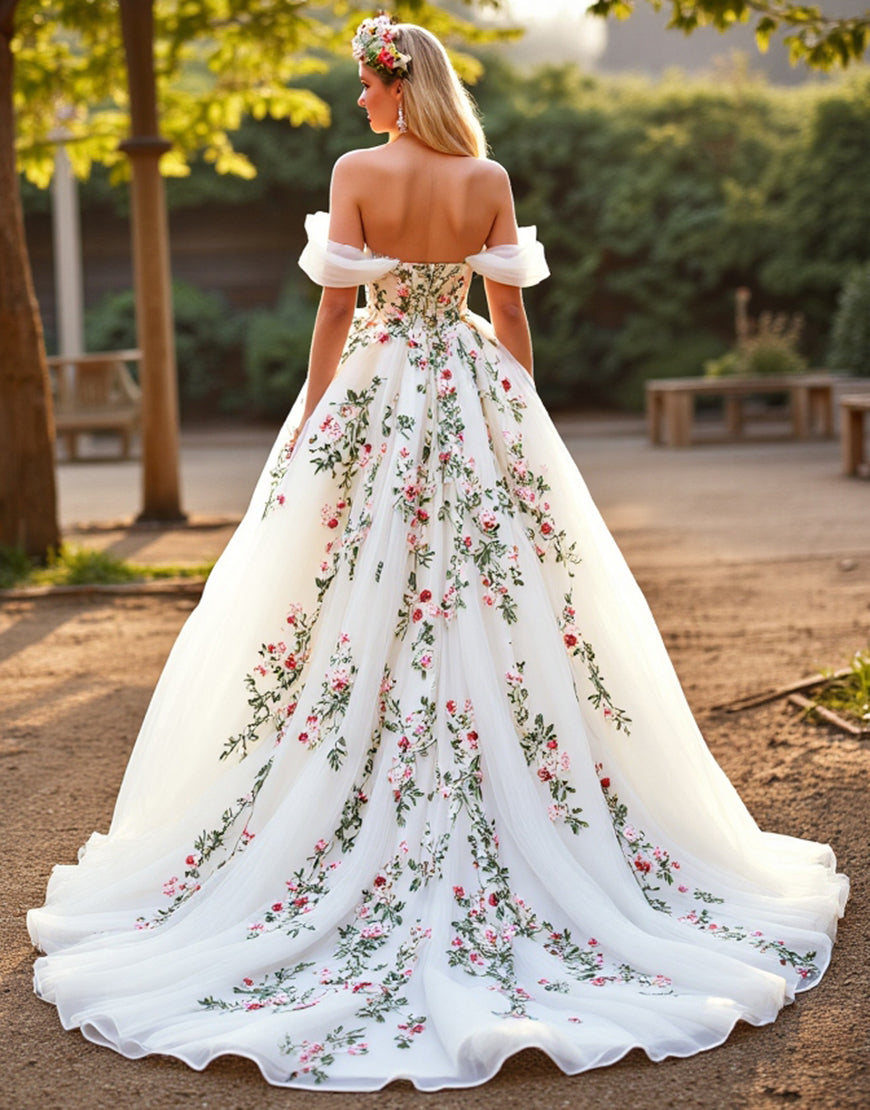 Off the Shoulder White Floral Sweep Train Tulle Wedding Dress