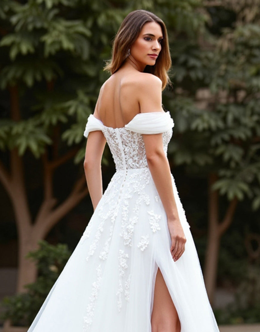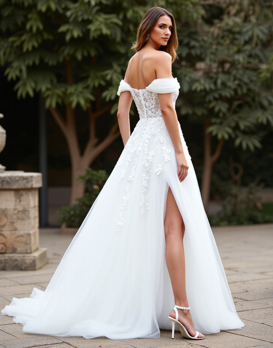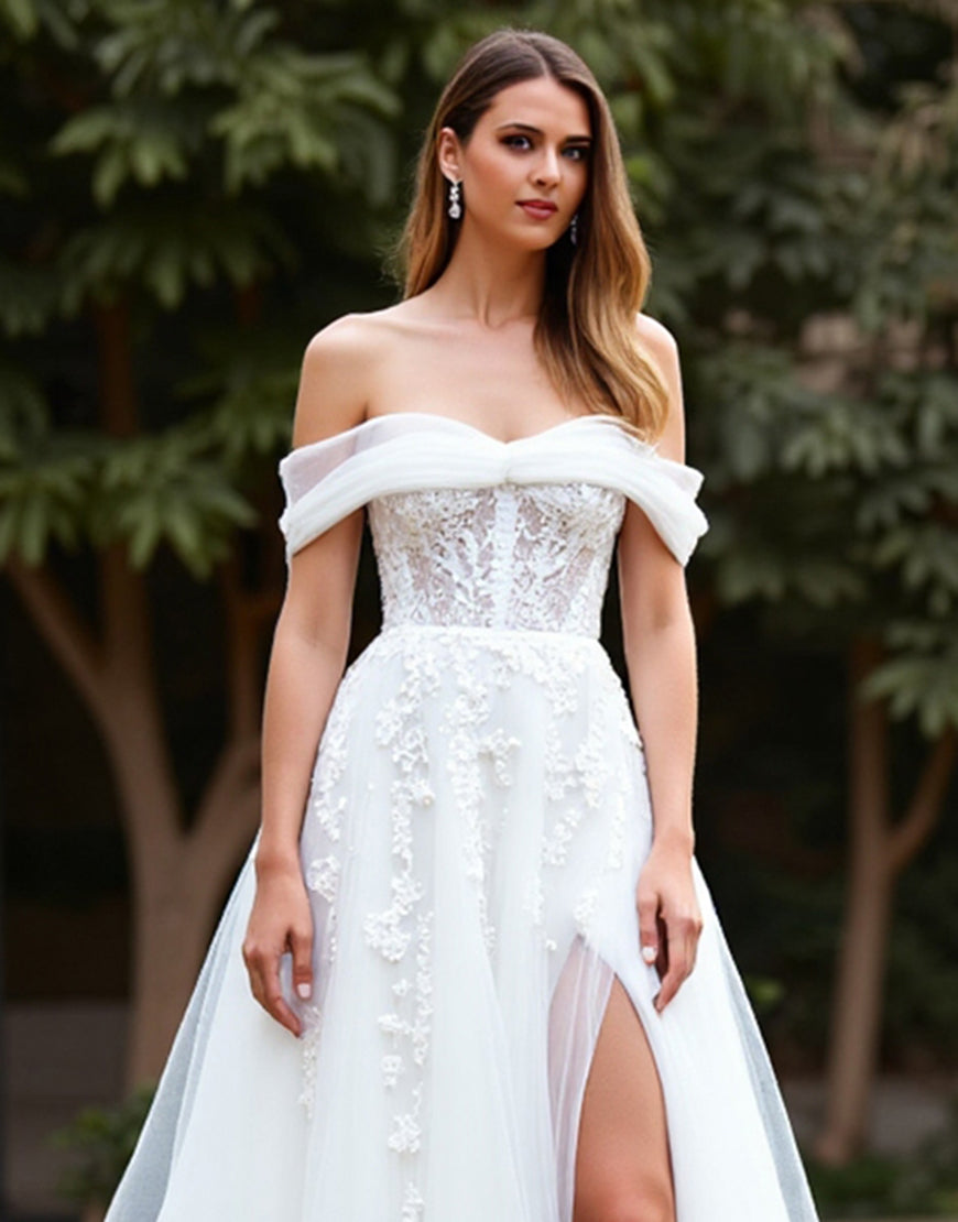 Off the Shoulder White A Line Tulle Wedding Dressn with Slit