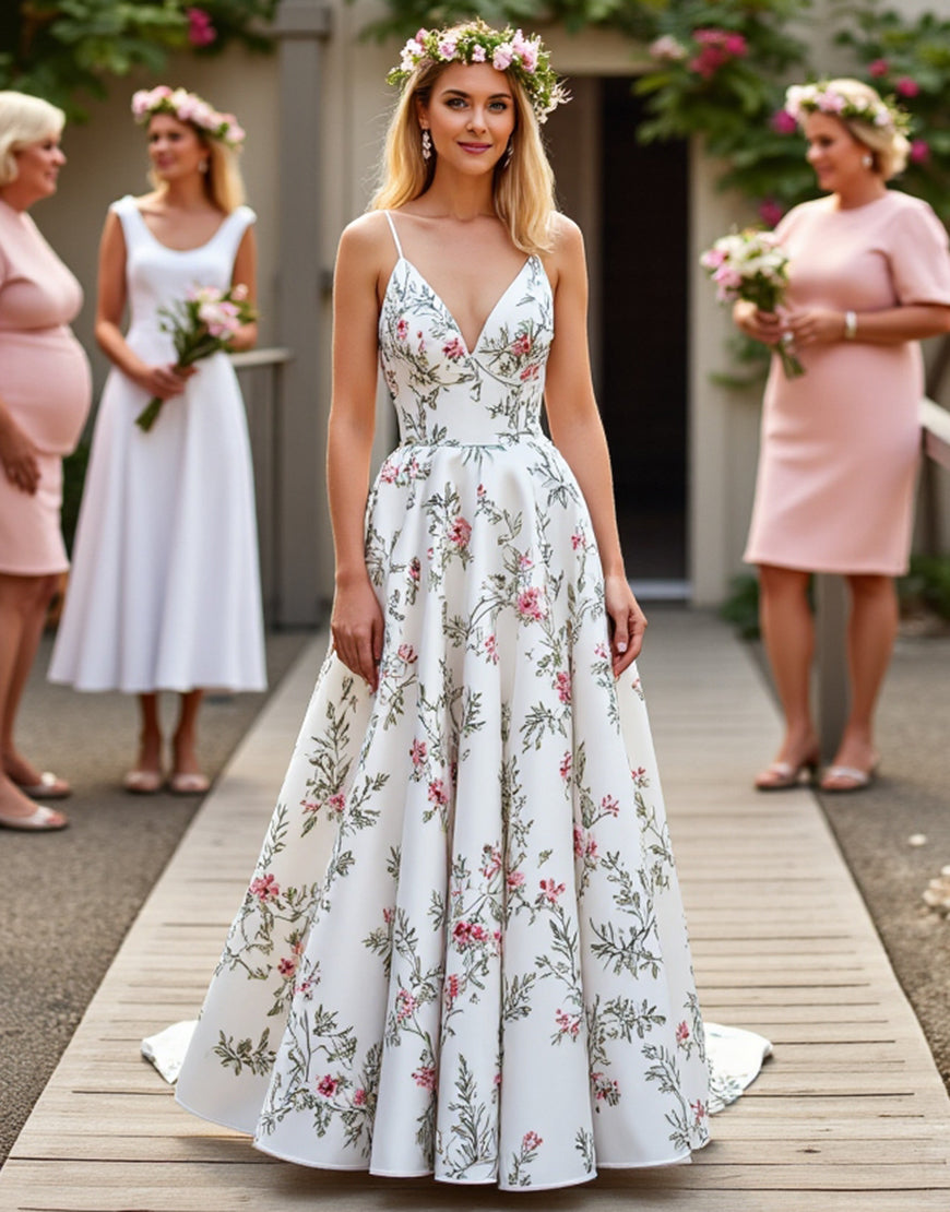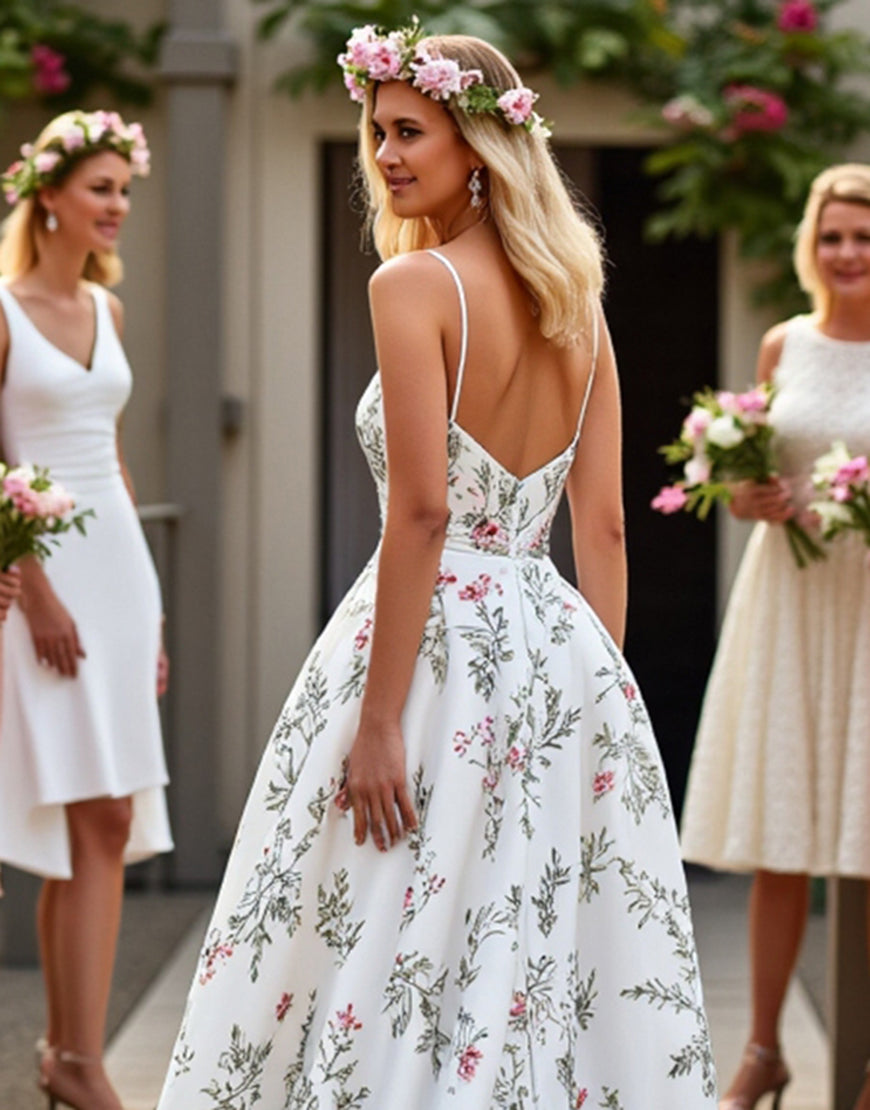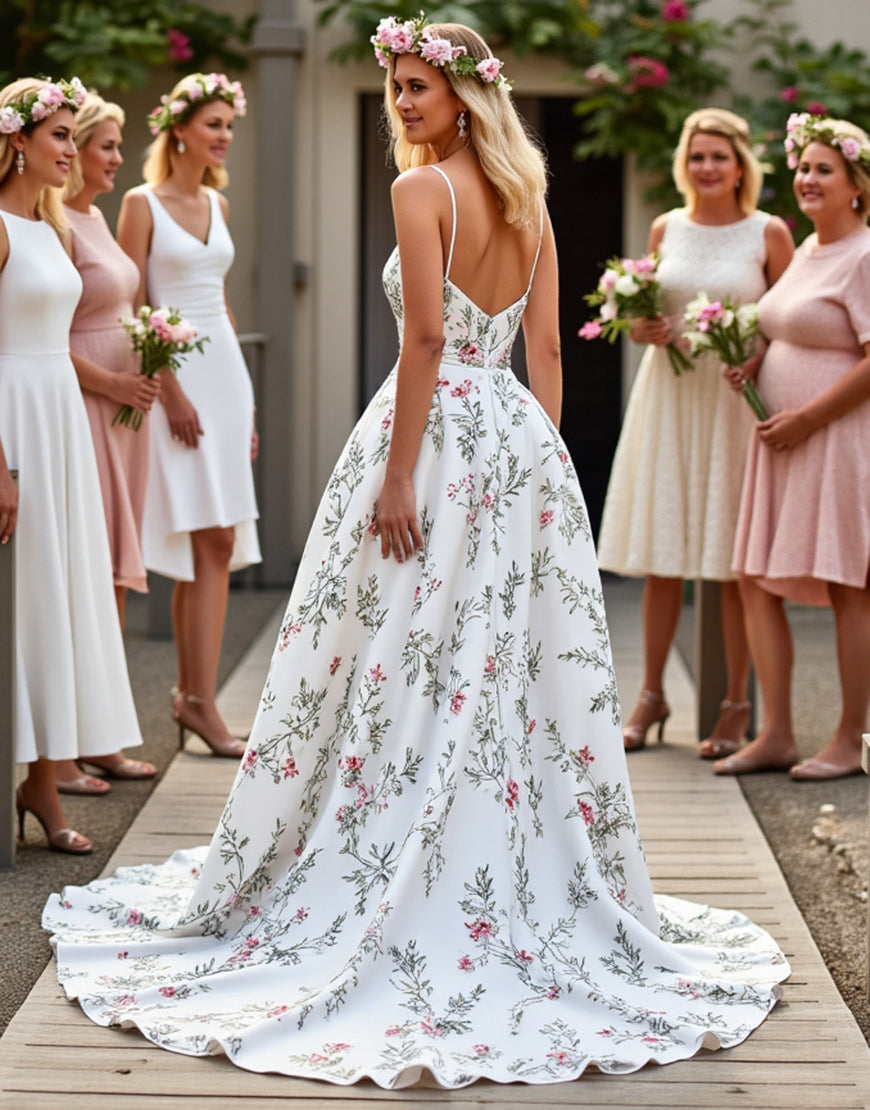 White Floral A Line Spaghetti Straps Sweep Train Wedding Dress