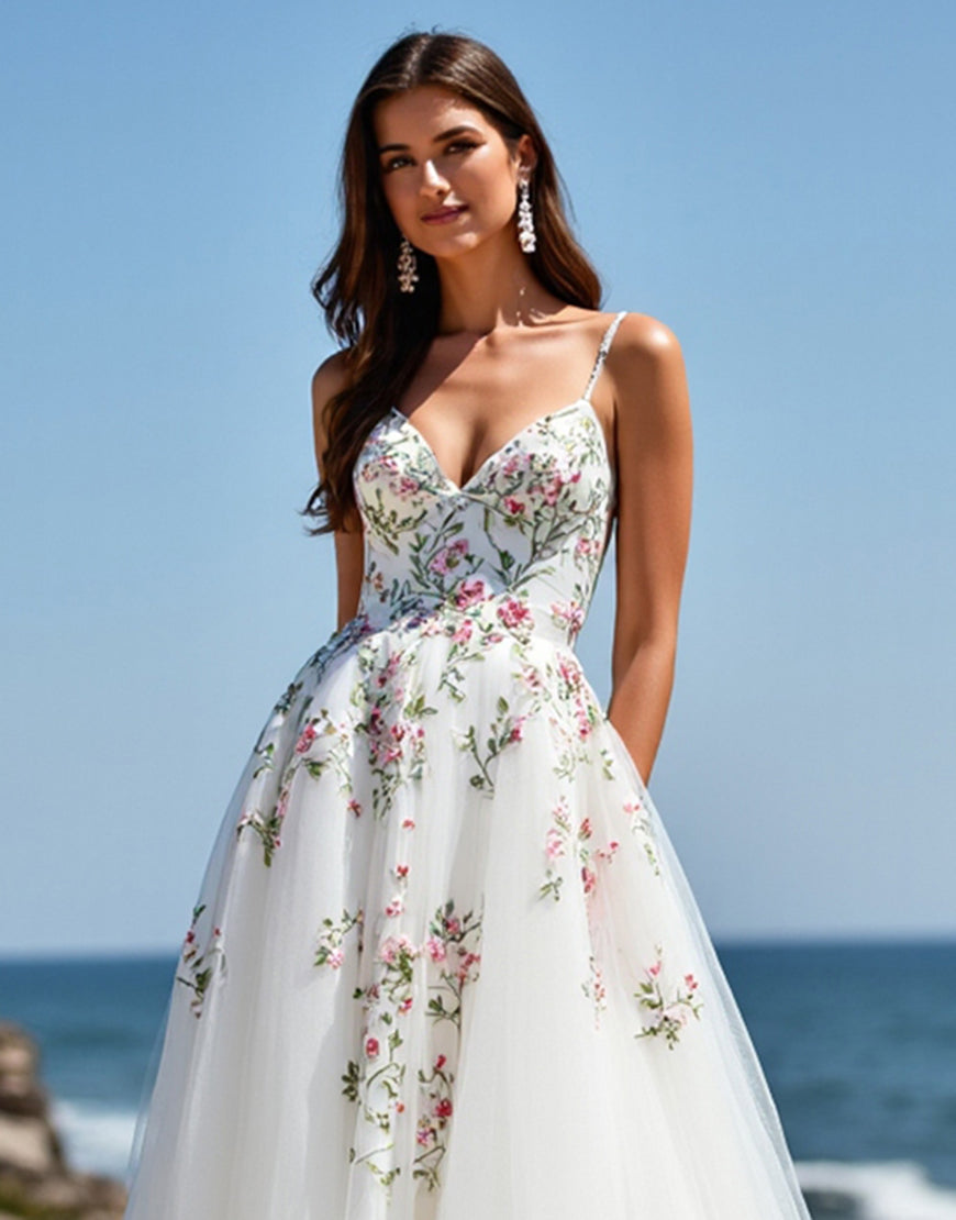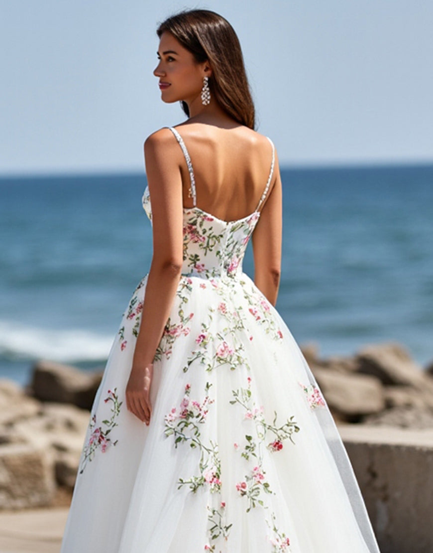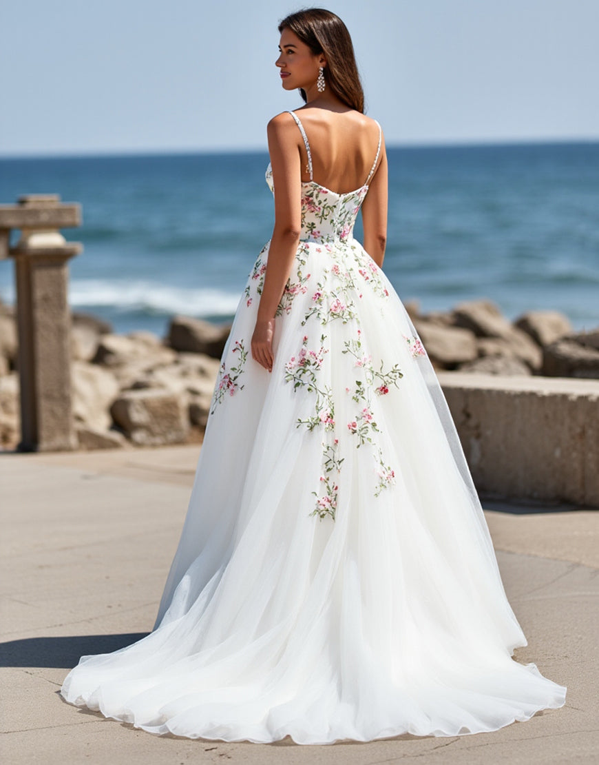White A Line Tulle Sweep Train Floral Wedding Dress