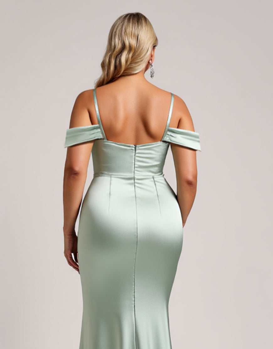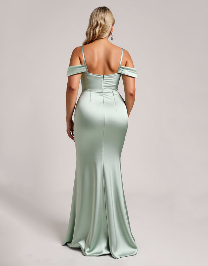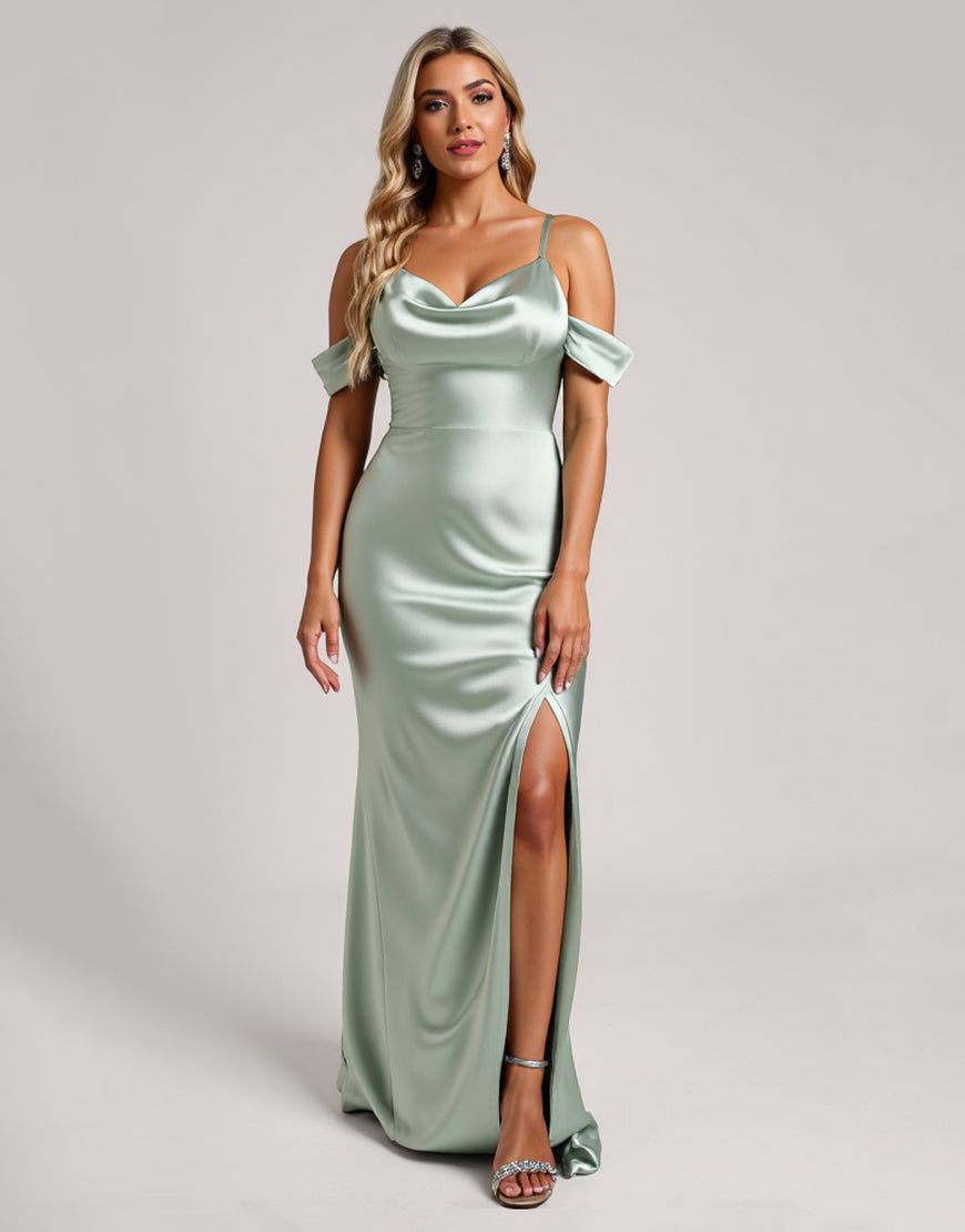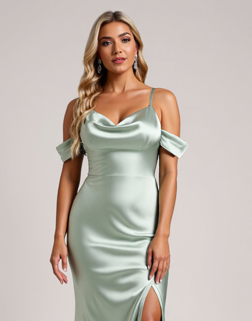 Satin Cold Shoulder Sage Green Bridesmaid Dress with Slit