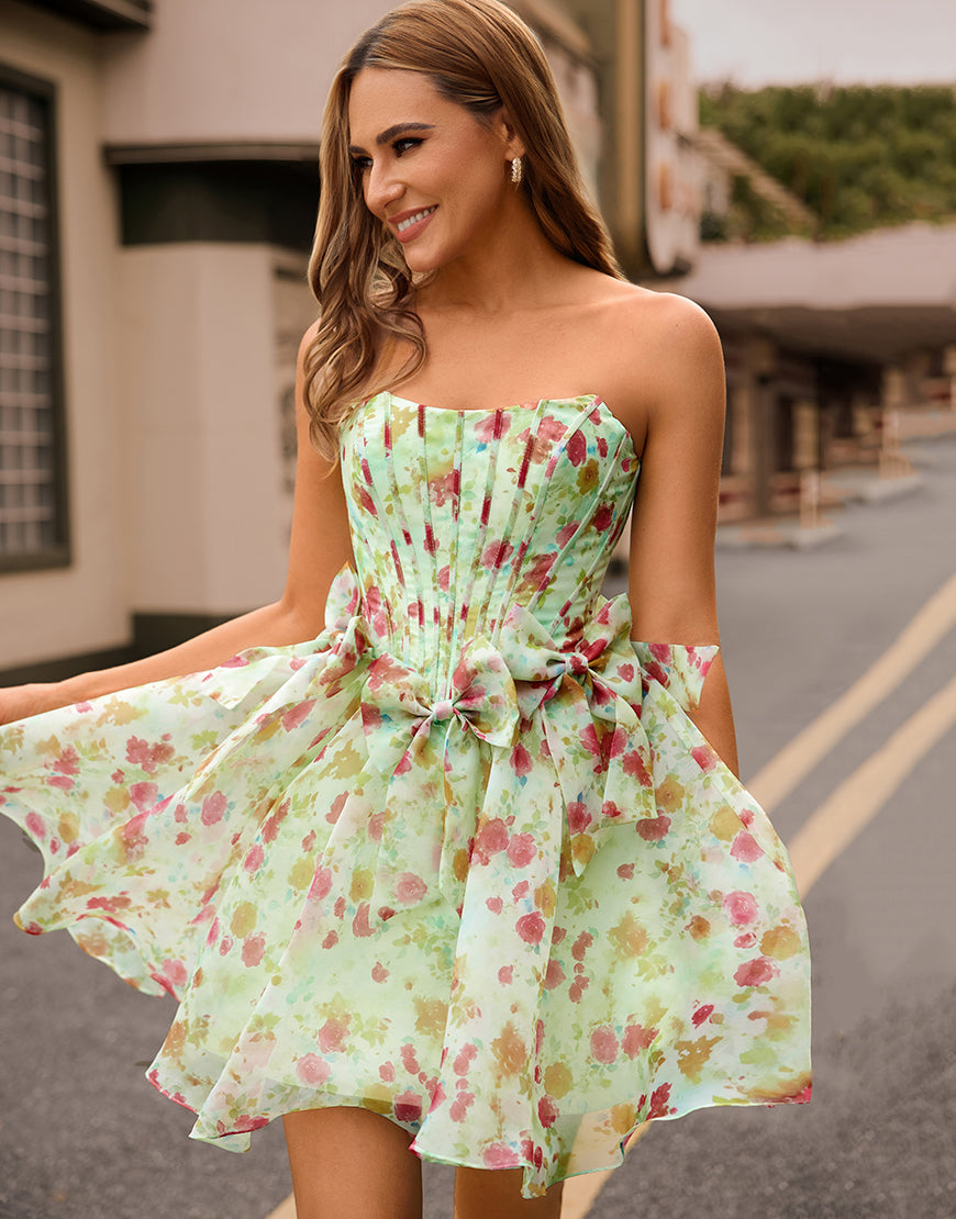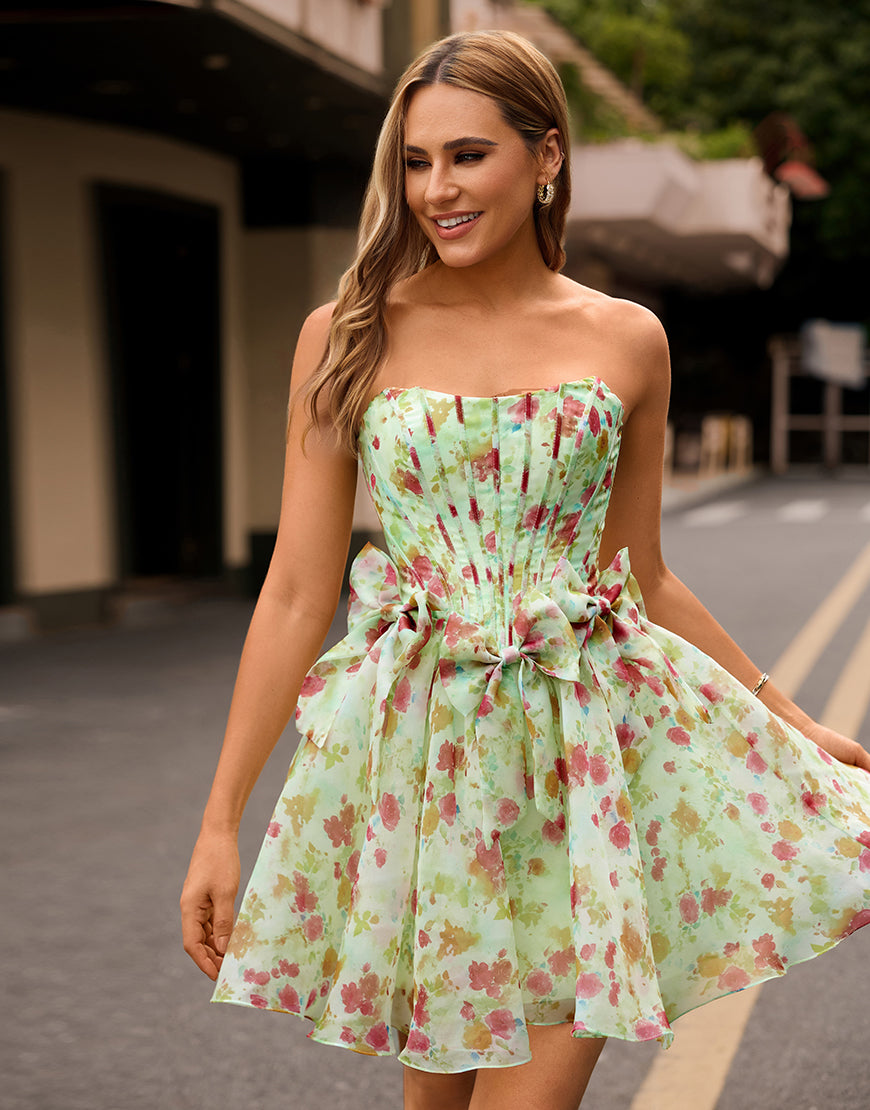 Green Printed A-Line Strapless Corset Homecoming Dress With Bows