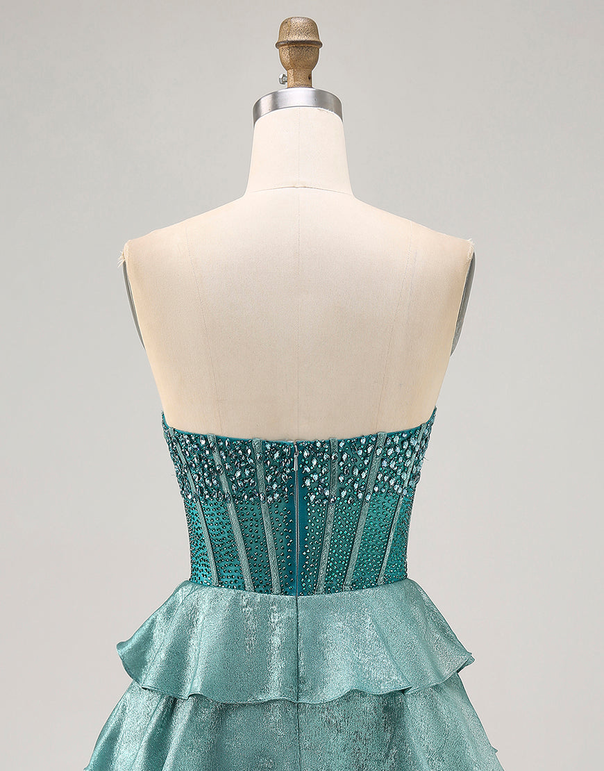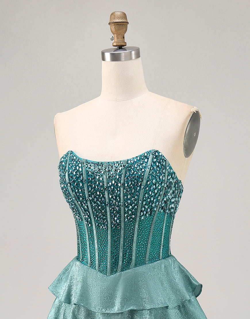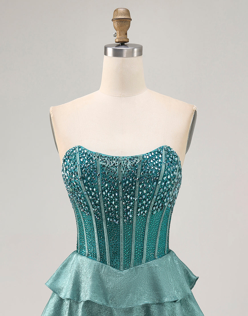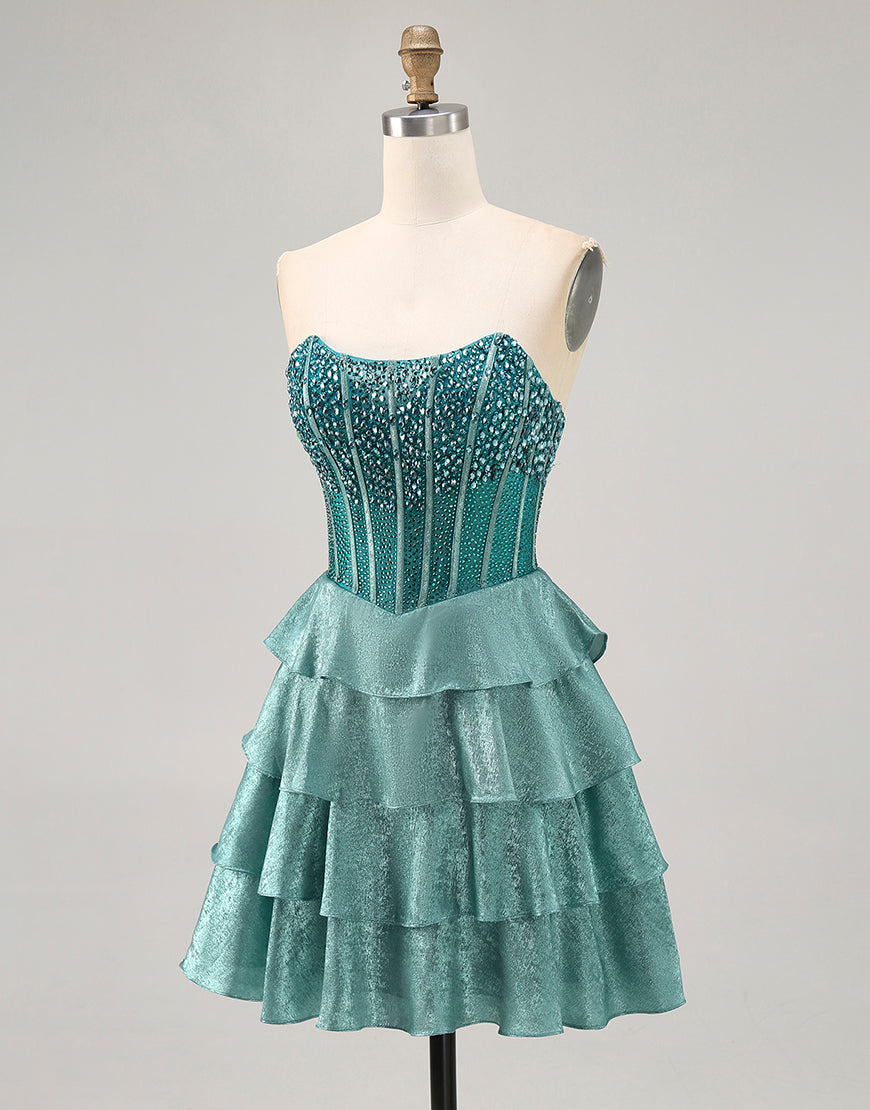 Peacock Green A-Line Corset Strapless Tiered Homecoming Dress with Rhinestones