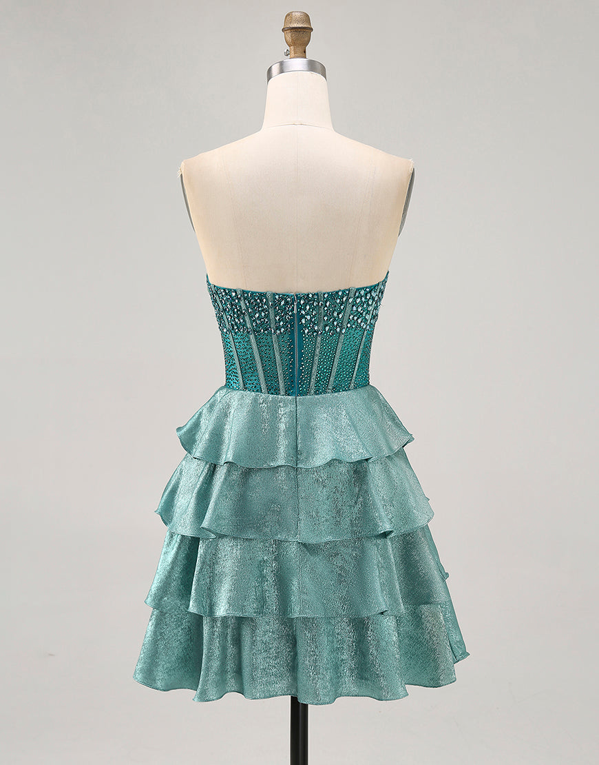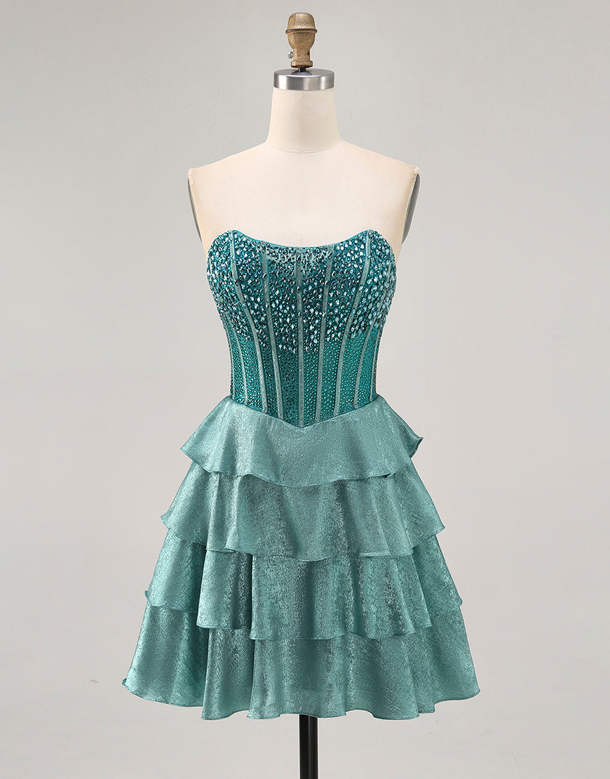 Peacock Green A-Line Corset Tiered Strapless Homecoming Dress