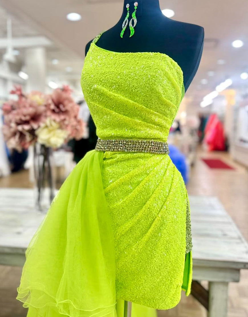 Sparkly One Shoulder Green Tight Homecoming Dress with Side Cape