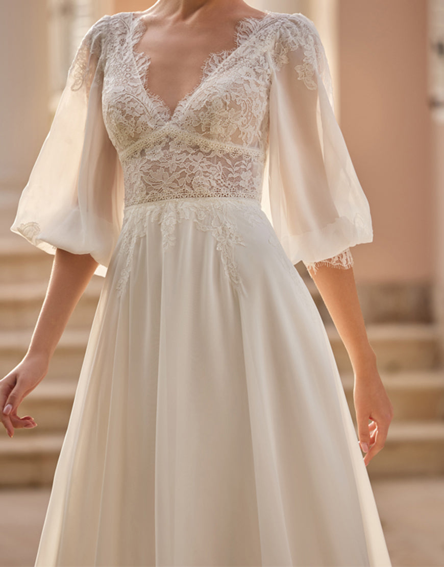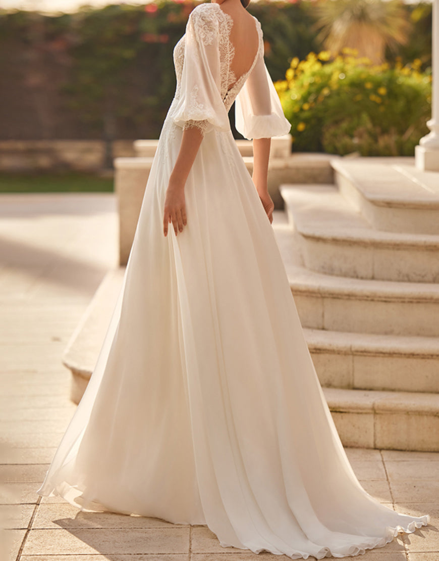 Ivory Lace Half Sleeve A Line Wedding Dress