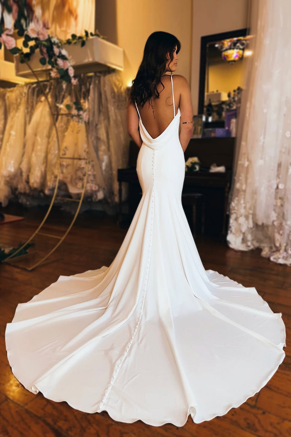 Design: Effortlessly embody beauty and elegance with our Ivory Mermaid Wedding Dress. The spaghetti straps, sleeveless design, and V-neckline accentuate your natural curves, while the backless style adds a touch of alluring charm. With a sweeping train, you'll make a lasting impression on your special day.