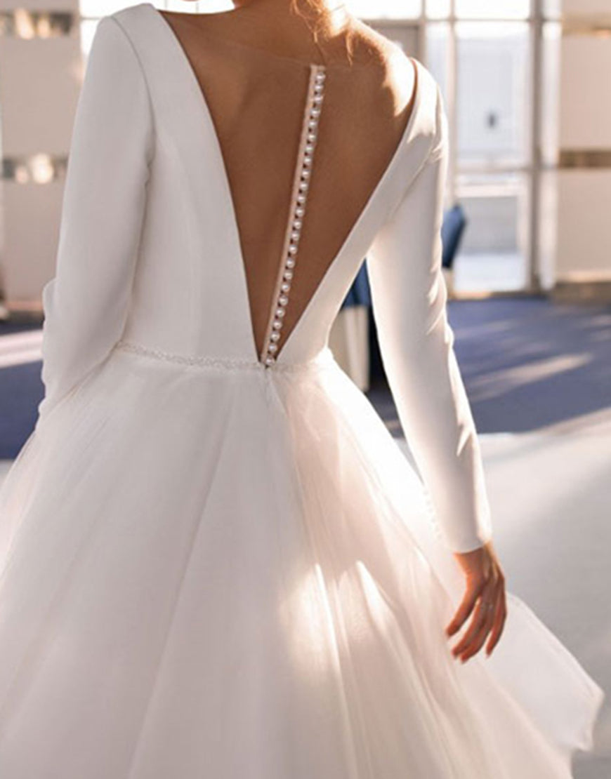 Long Sleeve V-Neck A Line Beaded White Wedding Dress
