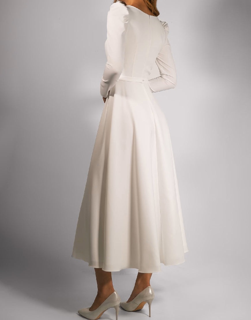 Long Sleeve A Line Square Neck White Midi Wedding Dress