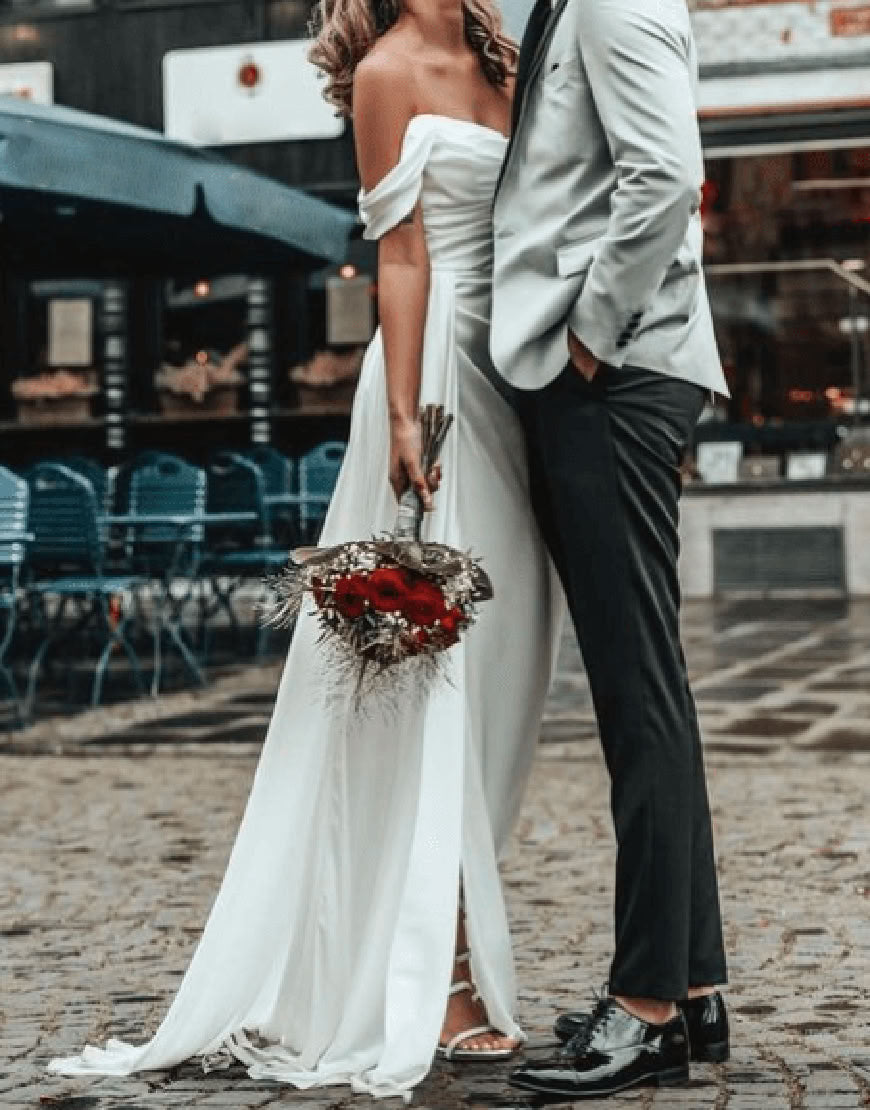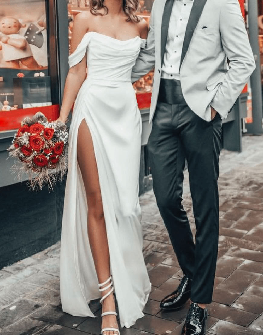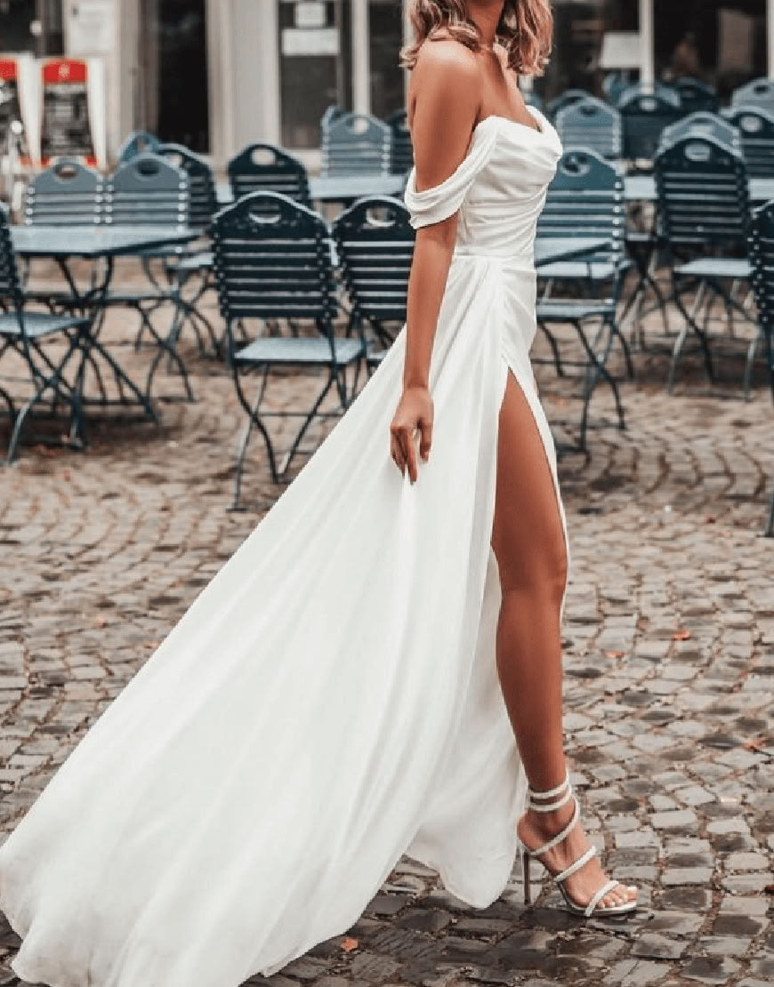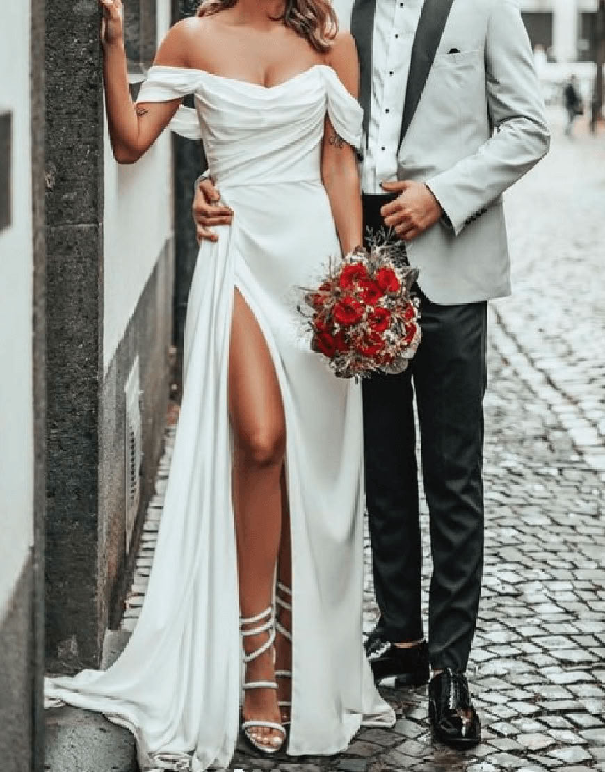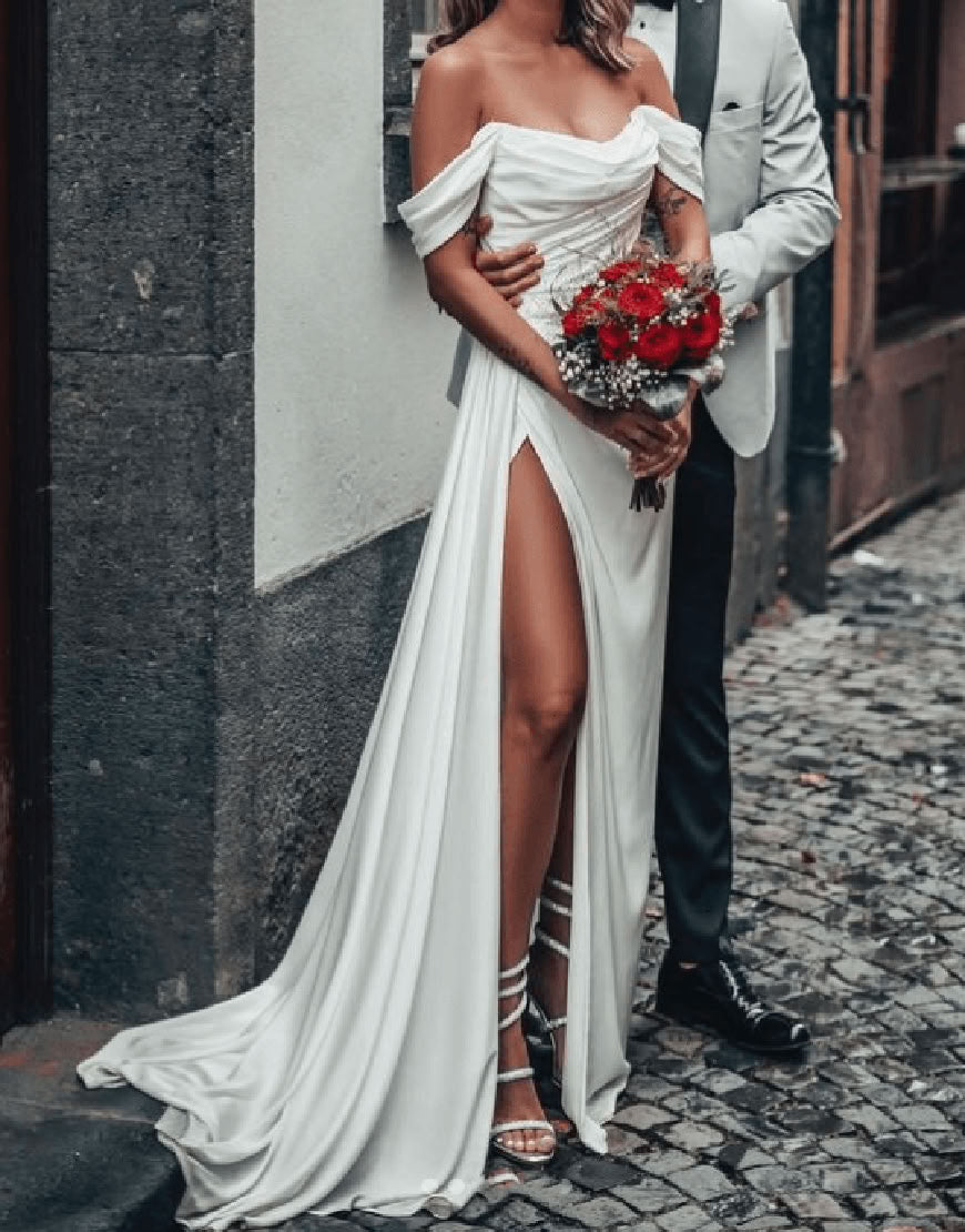 Off the Shoulder Sheath Ruched Ivory Wedding Dress with Slit
