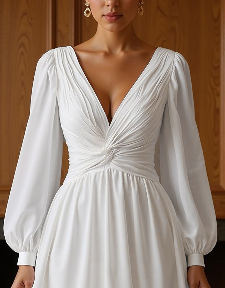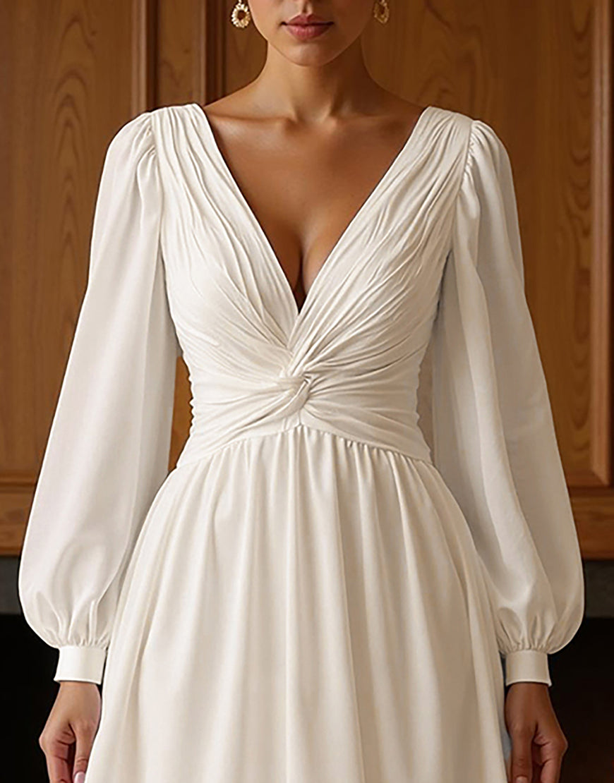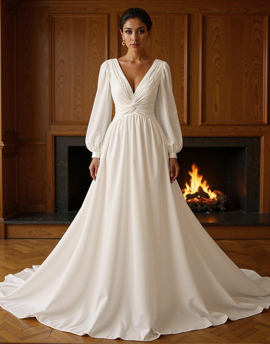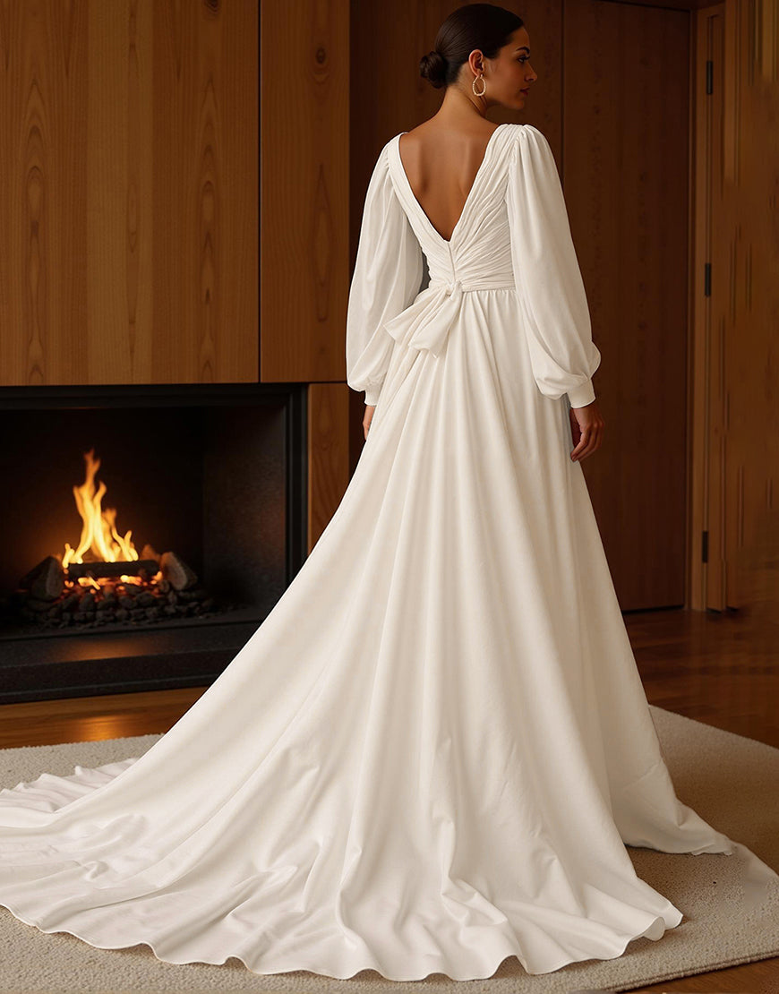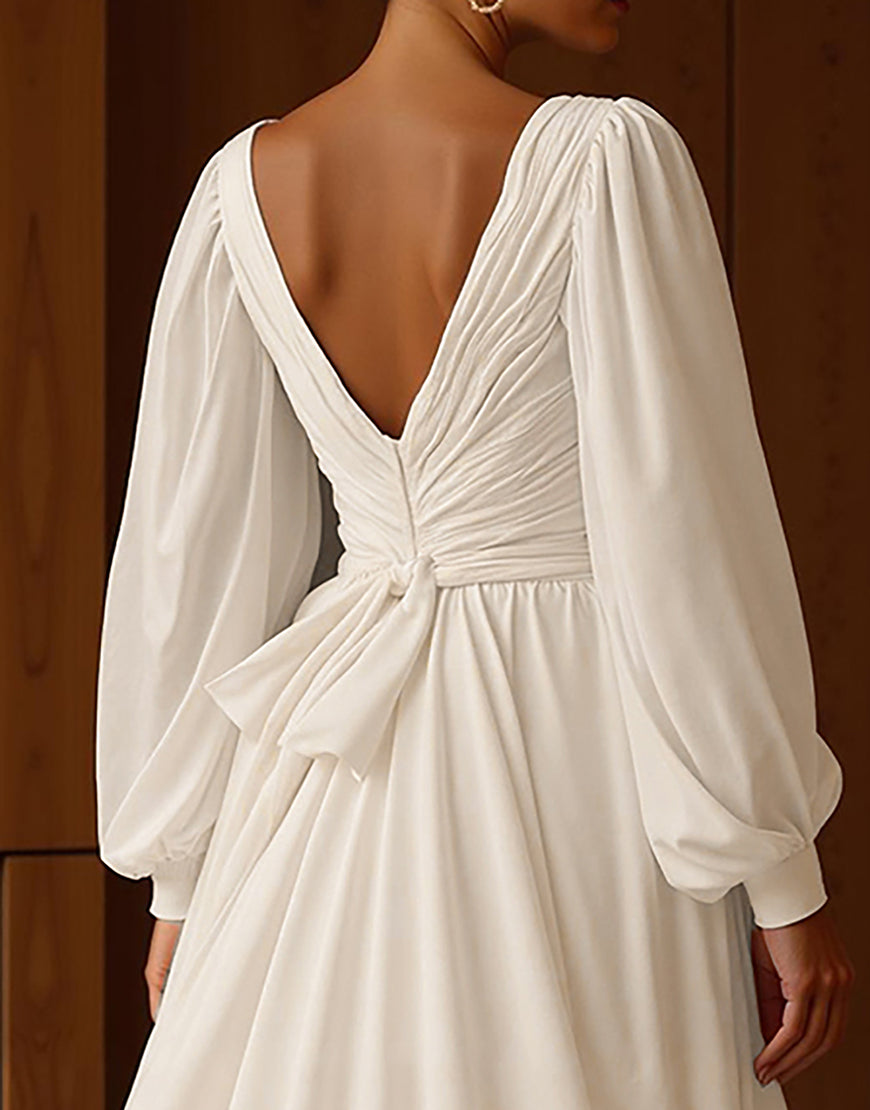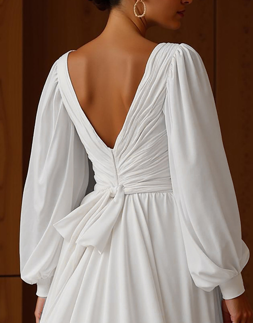White Long Sleeve Ruched A Line Wedding Dress with Sash