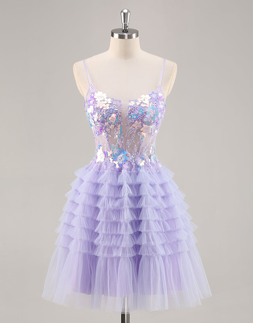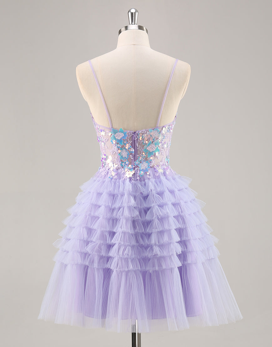 Corset A-Line Tiered Tulle Purple Homecoming Dress With Appliques