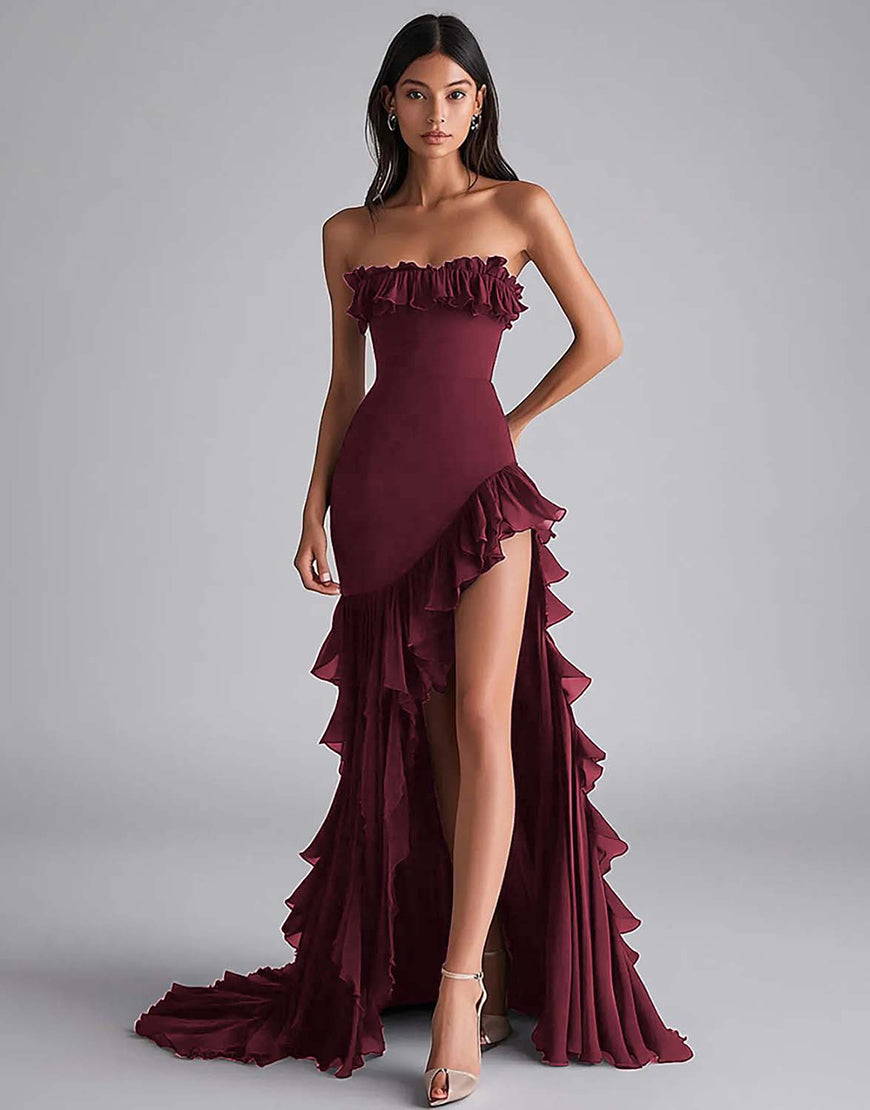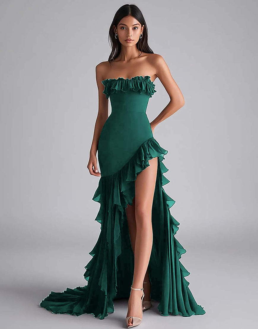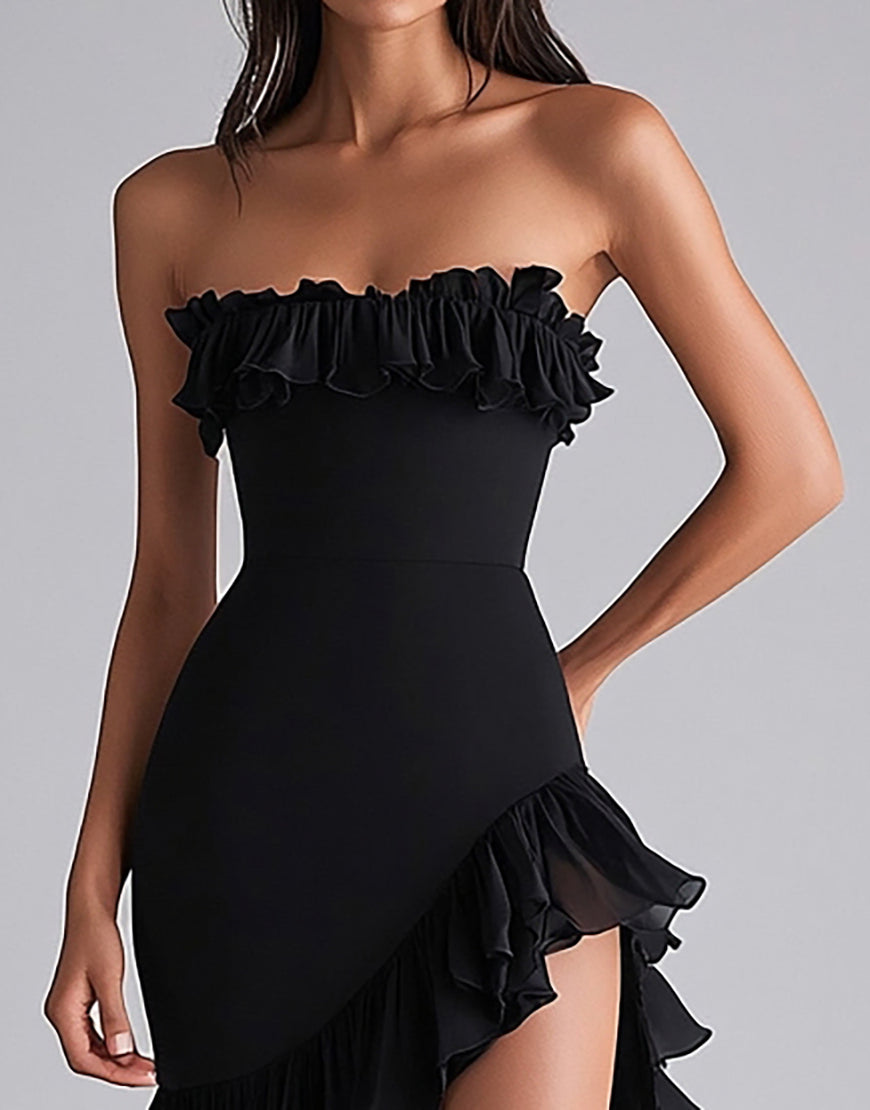 Black Mermaid Strapless Ruffled Formal Dress With Slit
