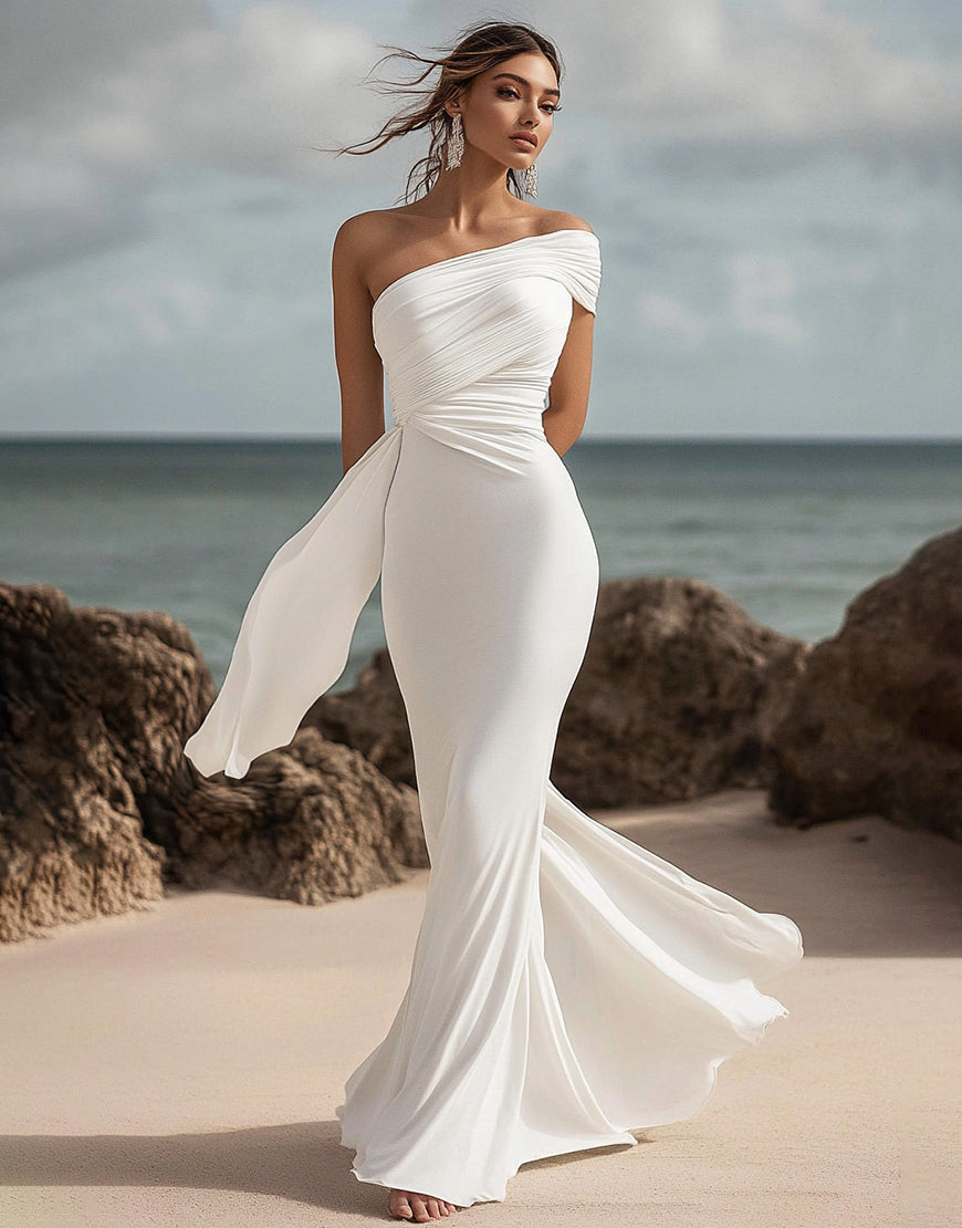 White One Shoulder Ruched Mermaid Long Formal Dress