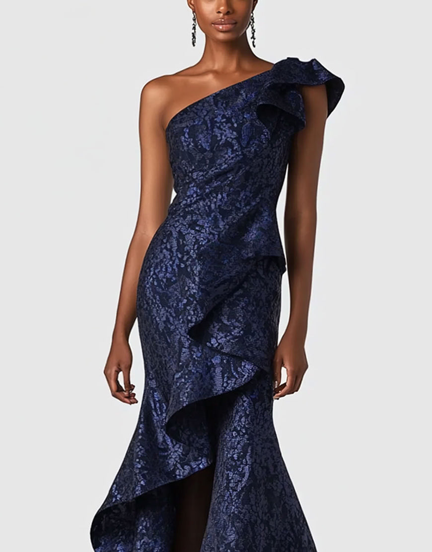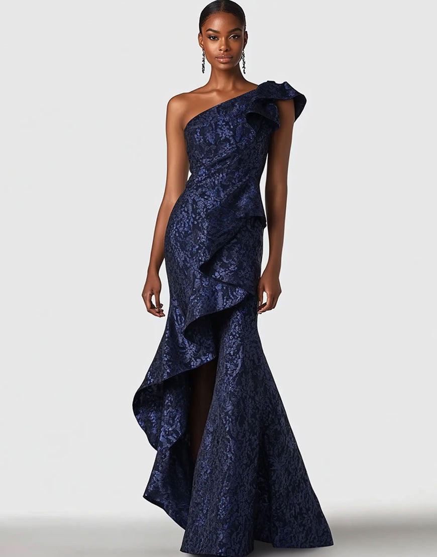 Navy One Shoulder Ruffled Mermaid Formal Dress