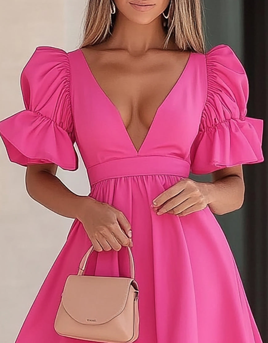 Hot Pink A Line V-Neck Ruffled Graduation Dress