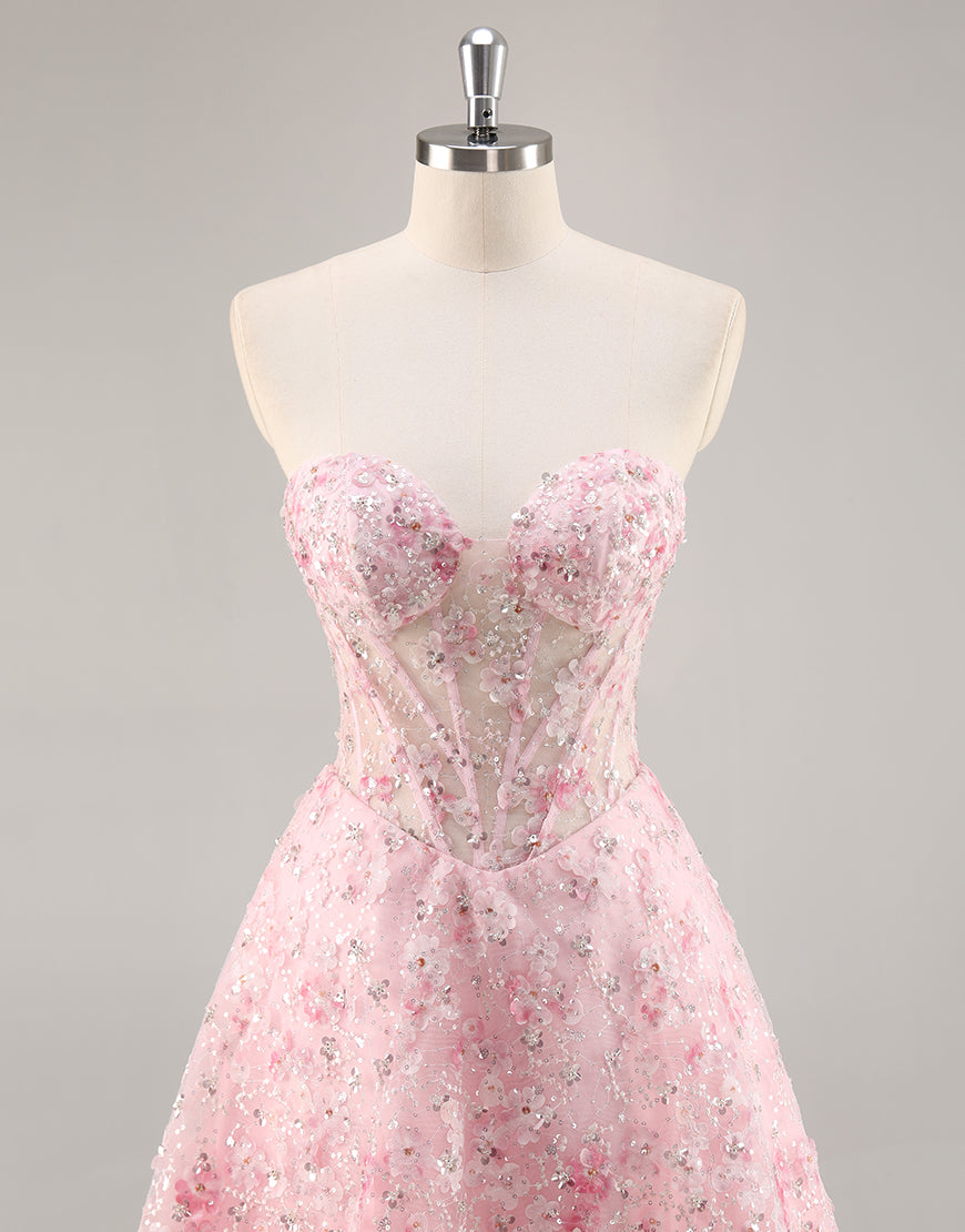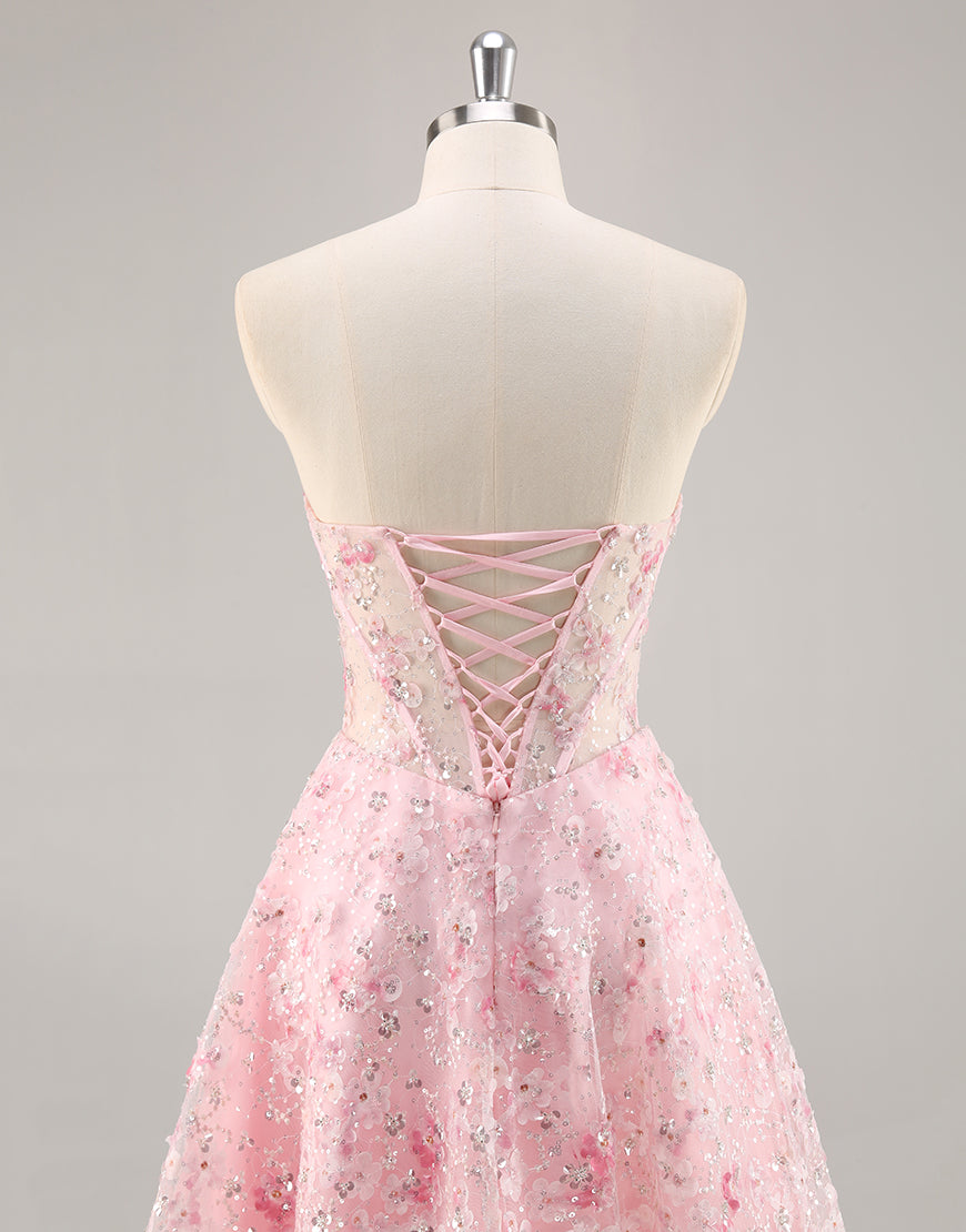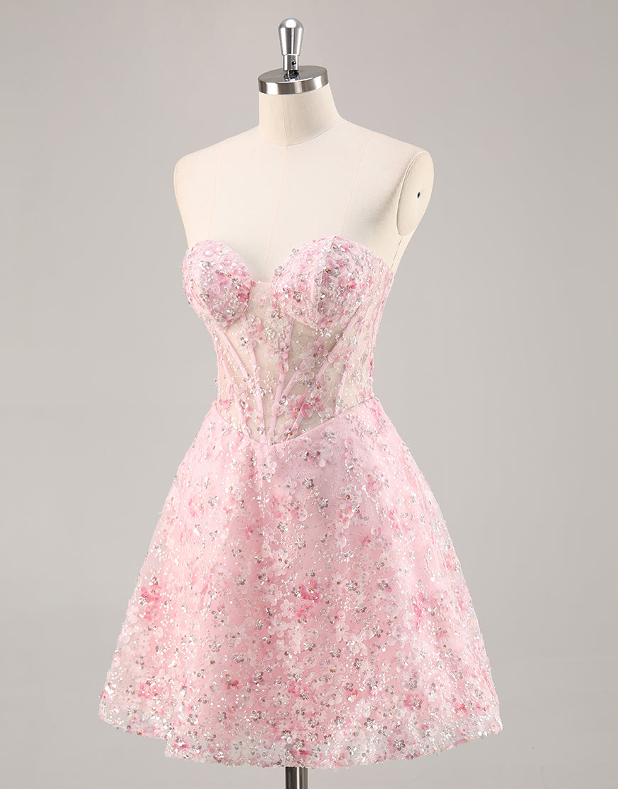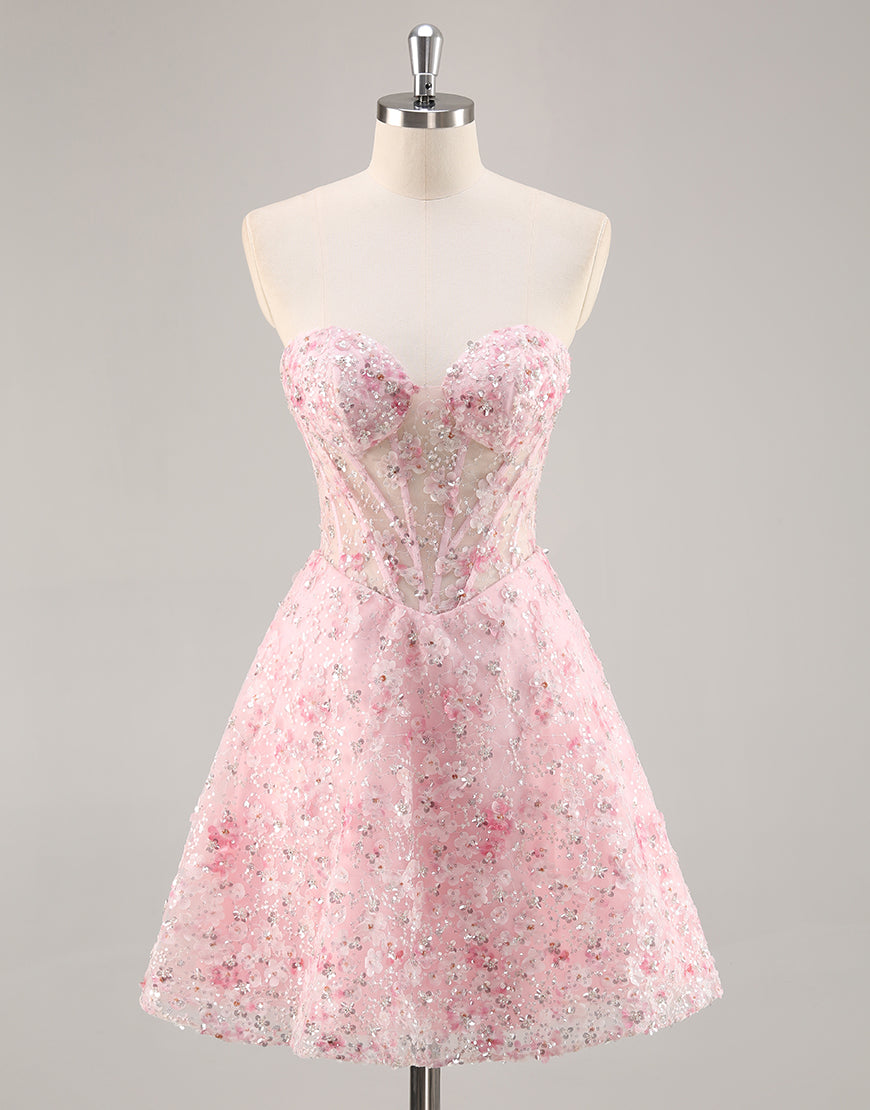 Floral Corset Strapless Pink Homecoming Dress with Appliques