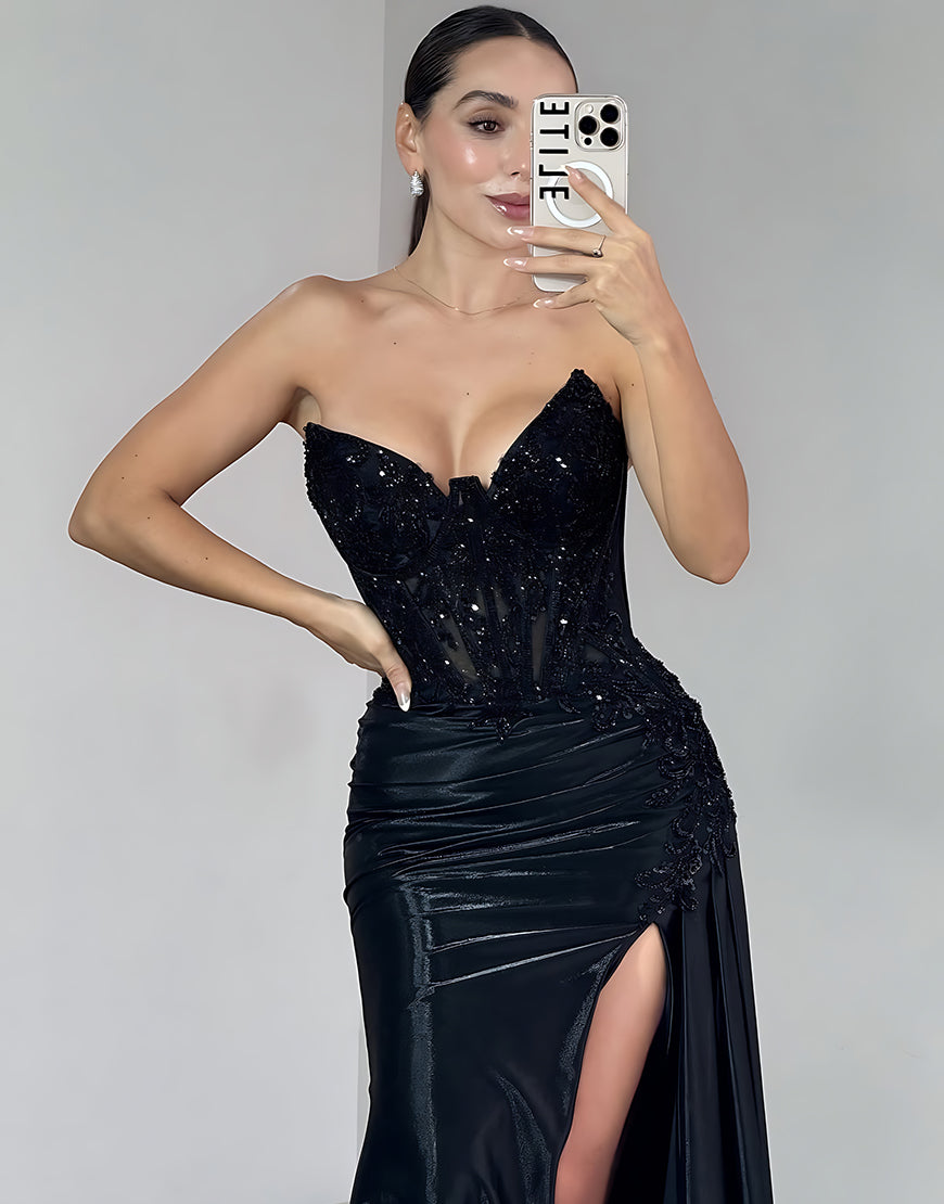 Black Strapless Mermaid Corset Prom Dress with Slit