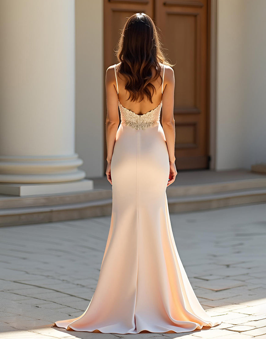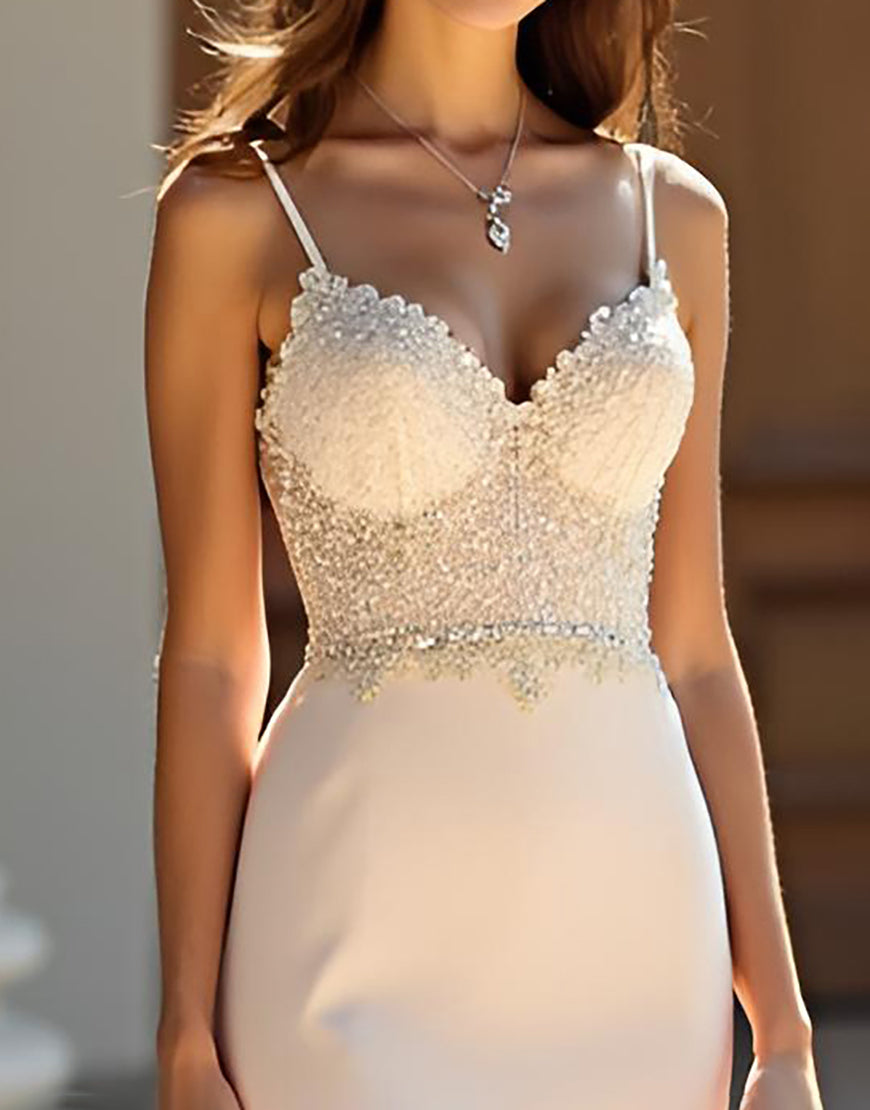 Design: Elevate your style with our Champagne Mermaid Spaghetti Crystal Applique Prom Dress. The stunning champagne color complements the mermaid silhouette, while the spaghetti straps and sweetheart neckline add a touch of elegance. Backless and adorned with crystal appliques, this dress is sure to make a lasting impression. Complete with a sweeping train, you'll feel like a true mermaid princess.