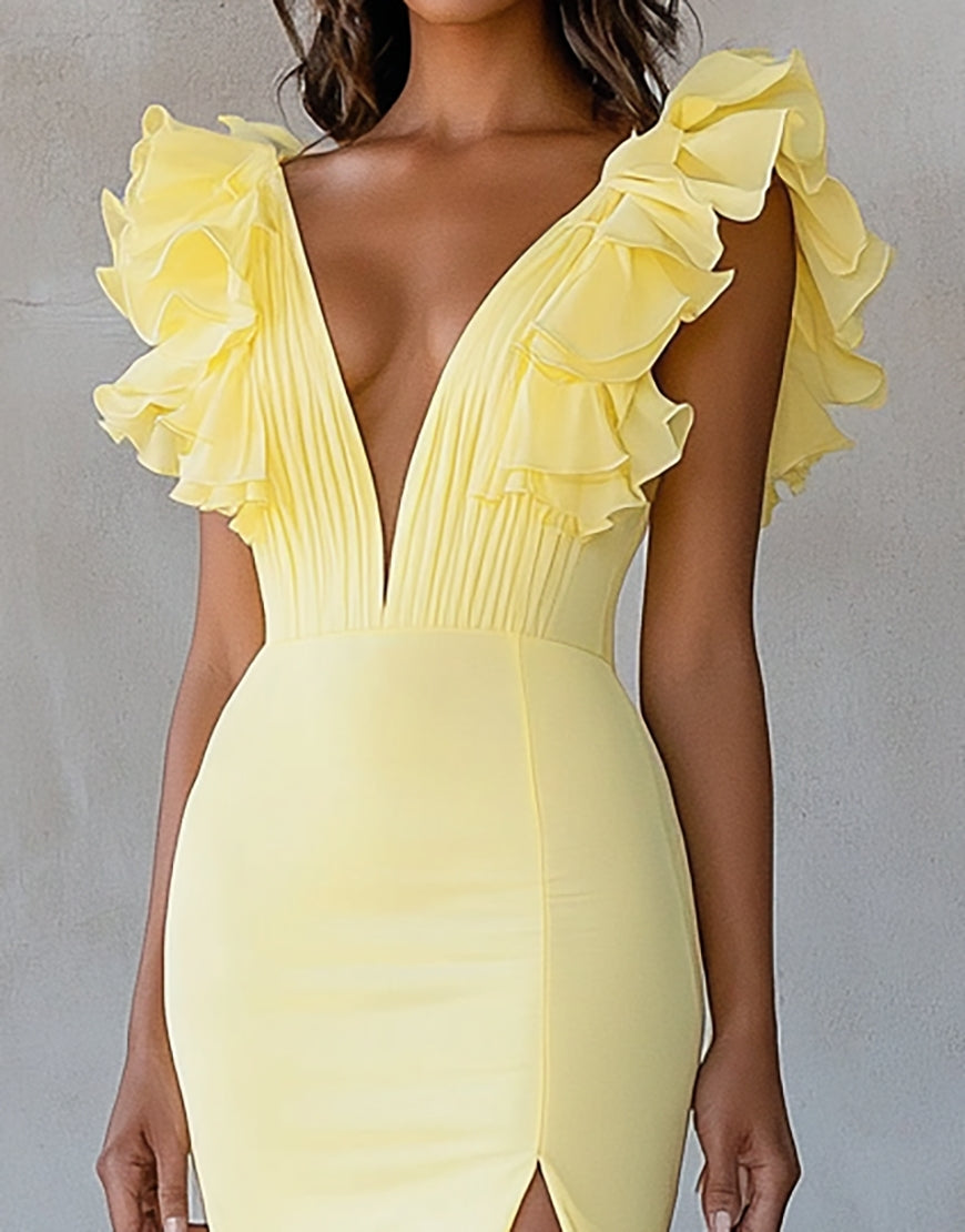 Mermaid Ruffled Yellow Formal Dress with Slit