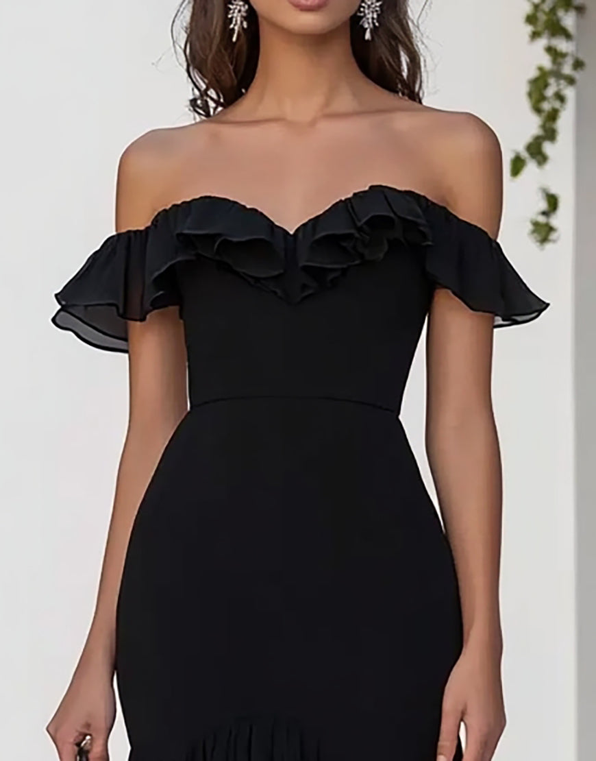 Off The Shoulder Mermaid Ruffled Black Tie Dress with Slit