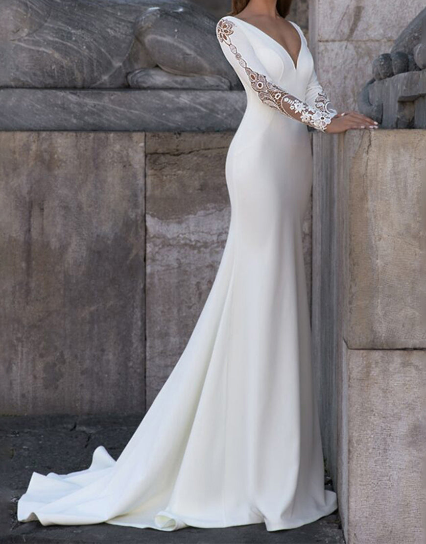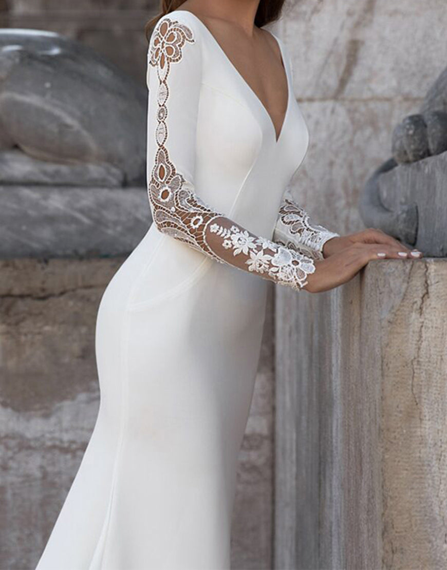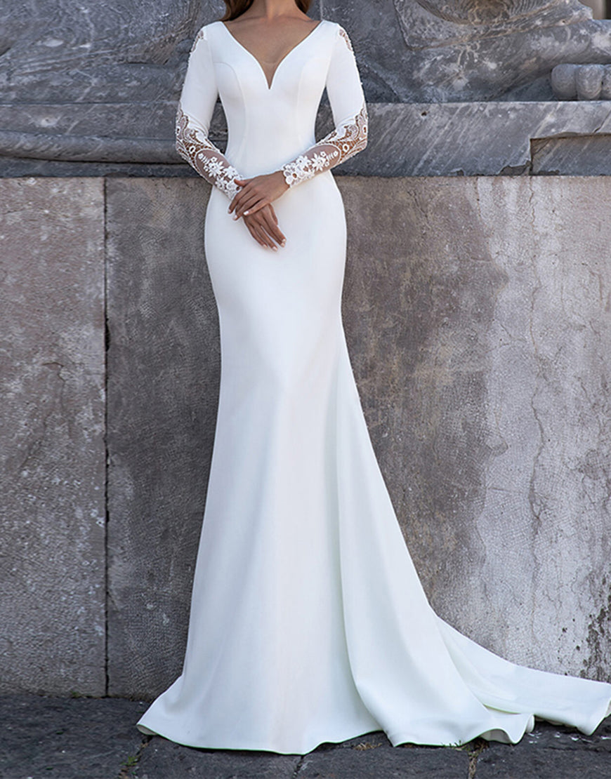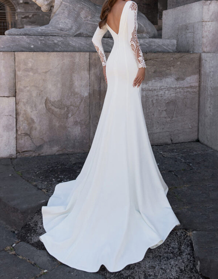 White Mermaid Long Sleeve Sweep Train Wedding Dress with Lace