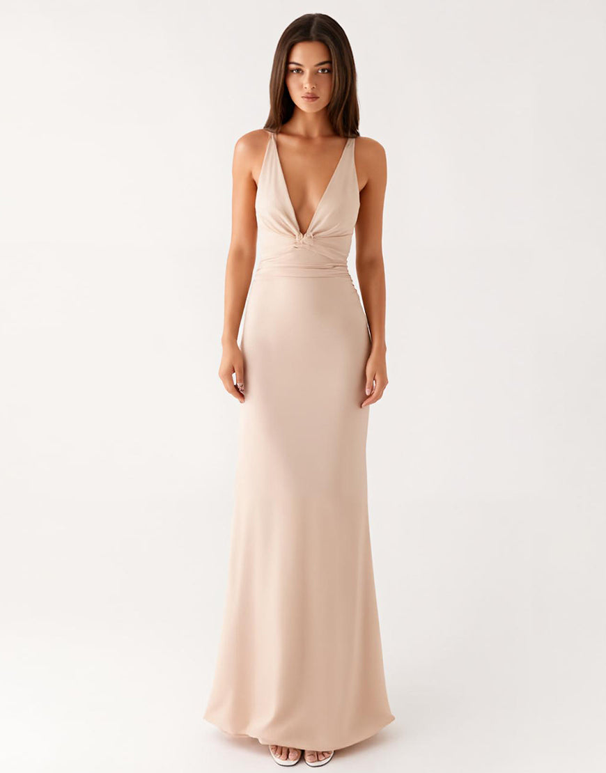 Apricot Deep V-Neck Sheath Ruched Formal Dress