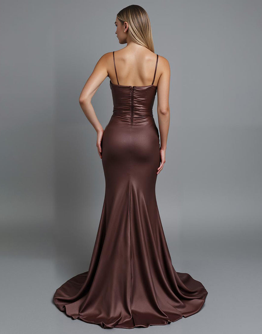 Coffee Satin Ruched Mermaid Spaghetti Straps Long Evening Dress