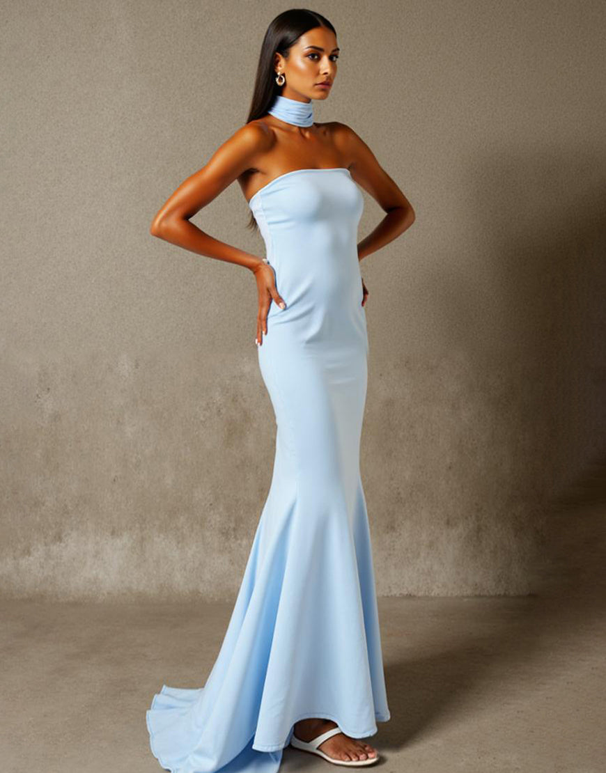 Sky Blue Mermaid Strapless Evening Dress With Sash