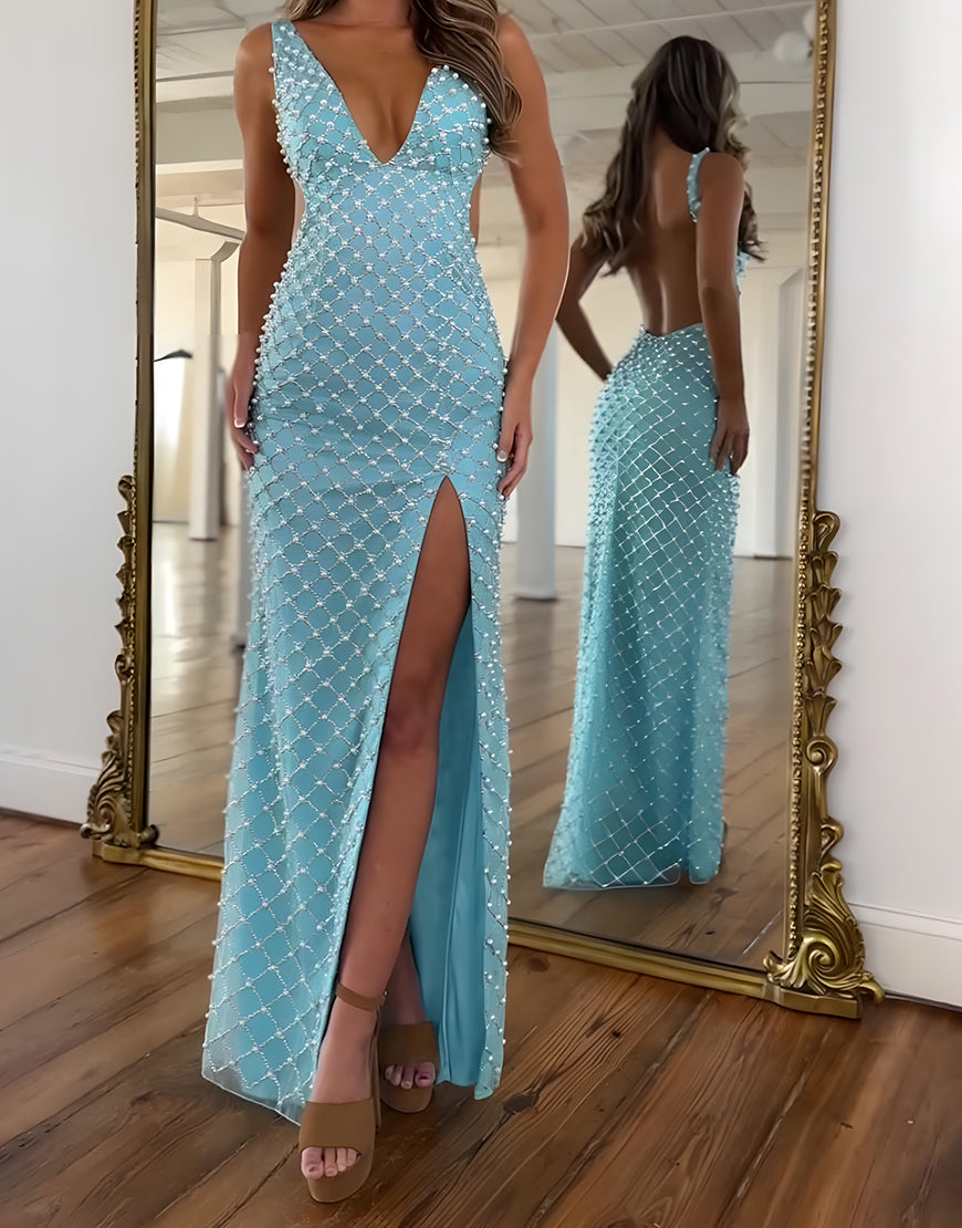 Beaded Sheath V-Neck Blue Prom Dress with Slit