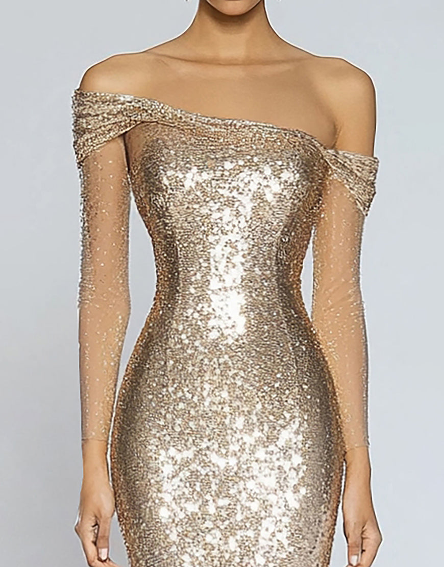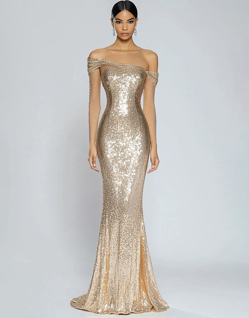 Sparkly Champagne Mermaid Off the Shoulder Sequins Long Formal Dress