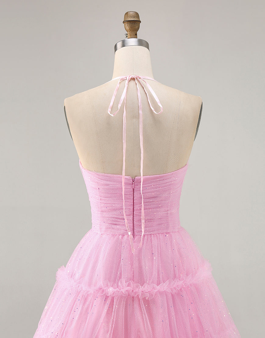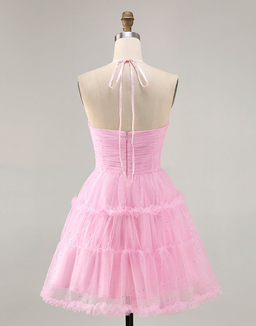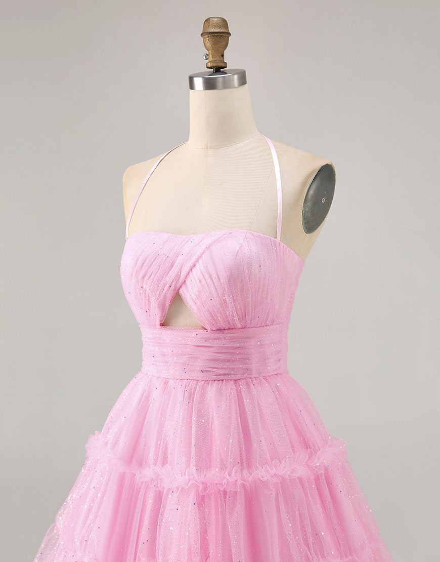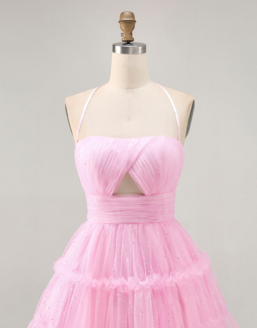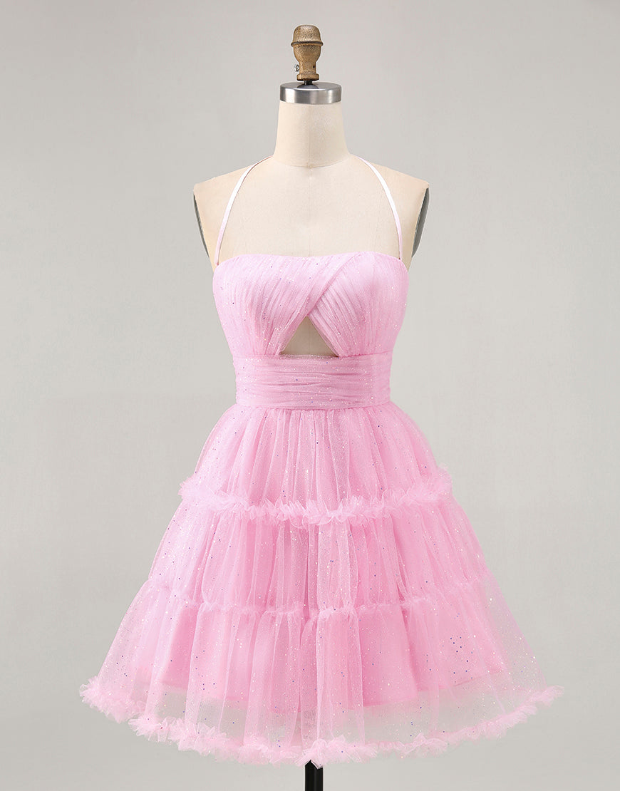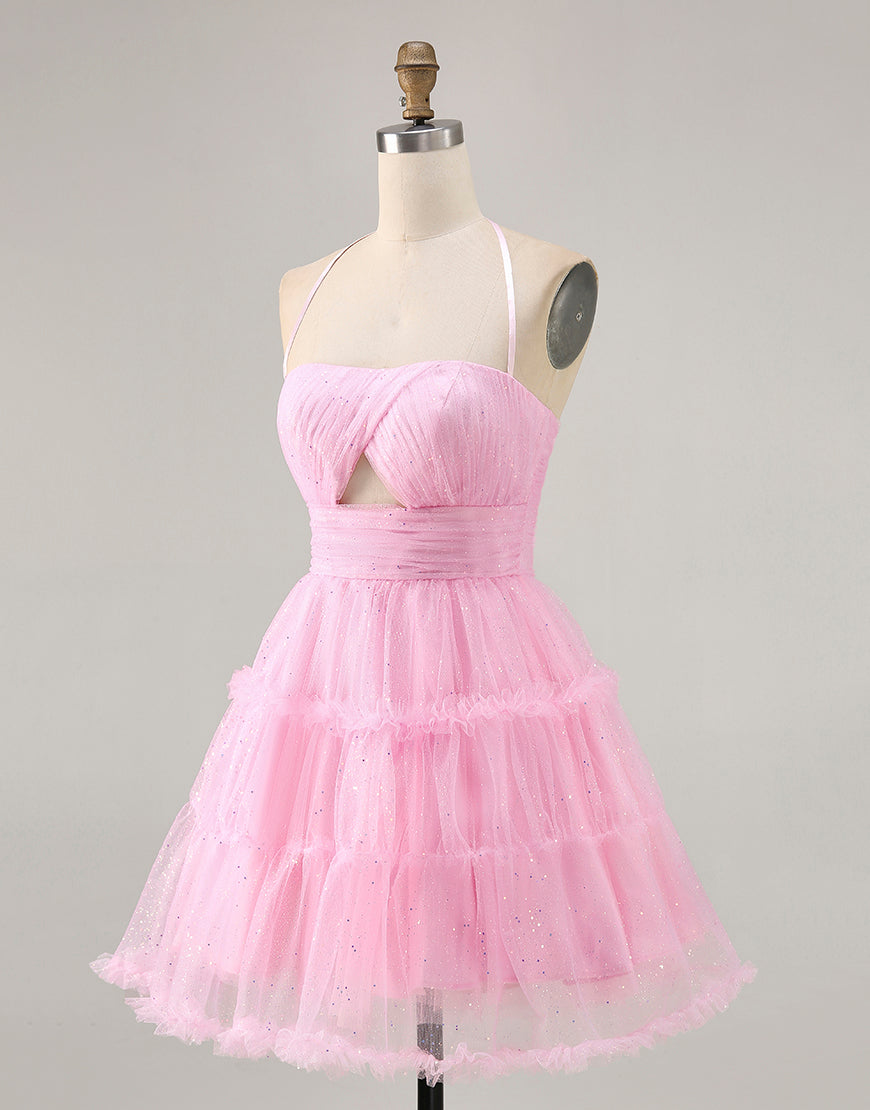 Pink Halter A-Line Cut-Out Homecoming Dress With Sequins