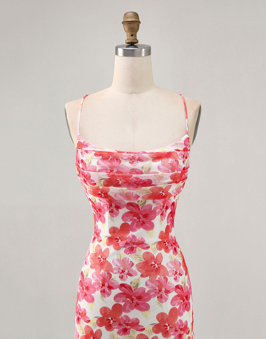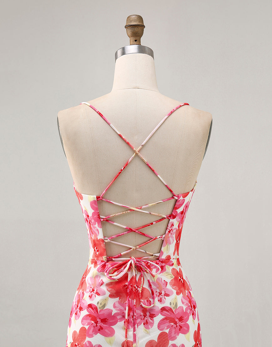 Red Flower Bodycon Spaghetti Straps Printed Mini Homecoming Dress