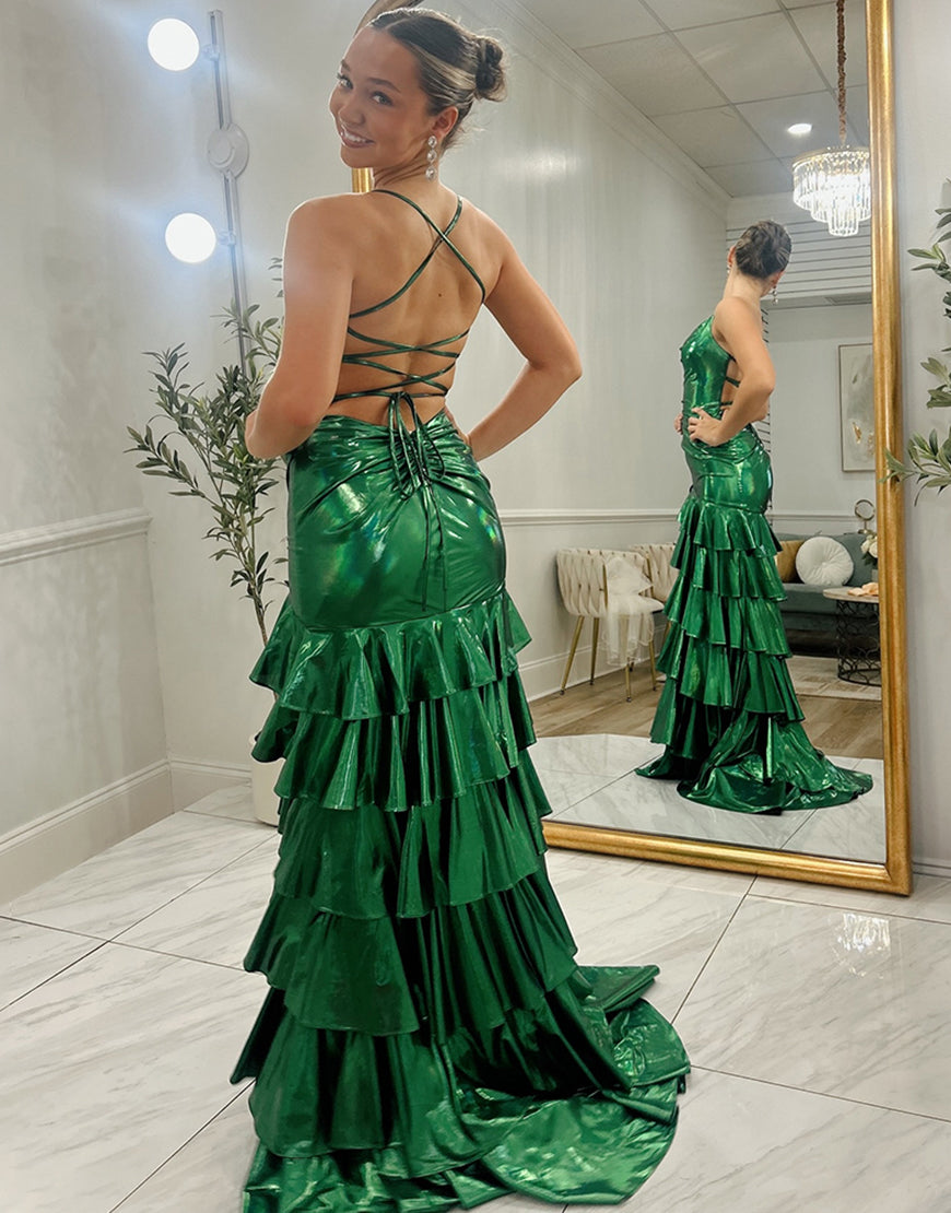 Dark Green Tiered Spaghetti Straps Ruched Prom Dress