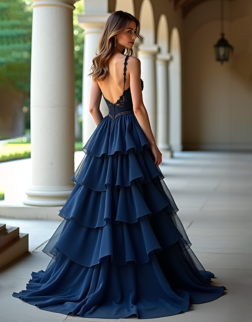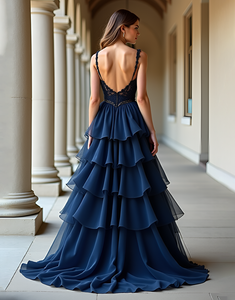 Design: Expertly crafted for prom, this navy A-line dress features delicate spaghetti straps and cascading ruffles. The sleeveless, backless design exudes elegance and the sweeping train adds a touch of drama. Perfect for making a statement on your special night.