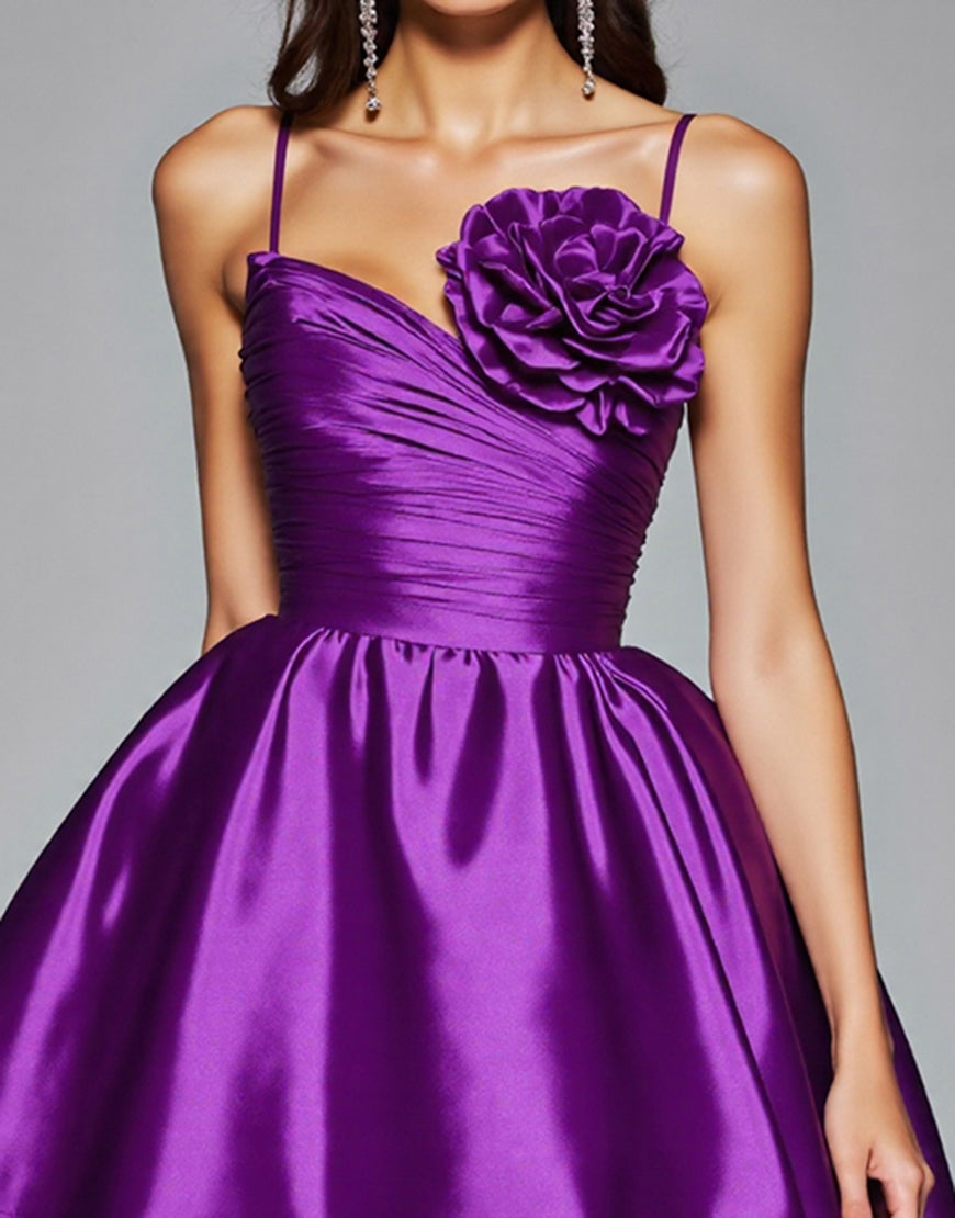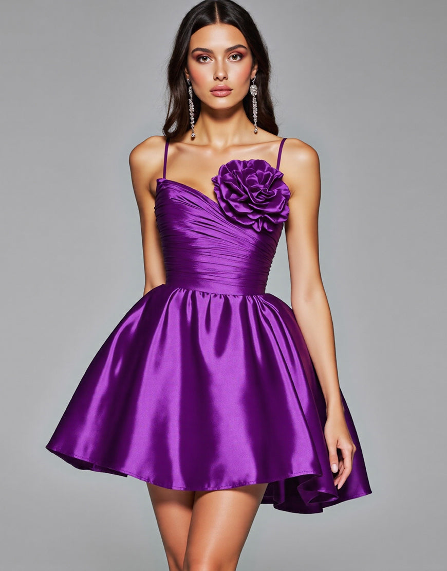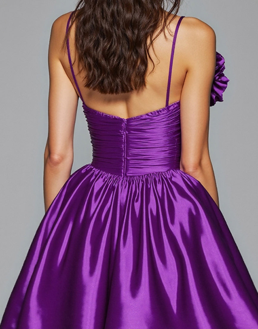 Dark Purple Ruched Satin Homecoming Dress with 3D Flowers