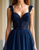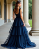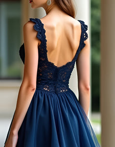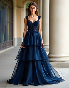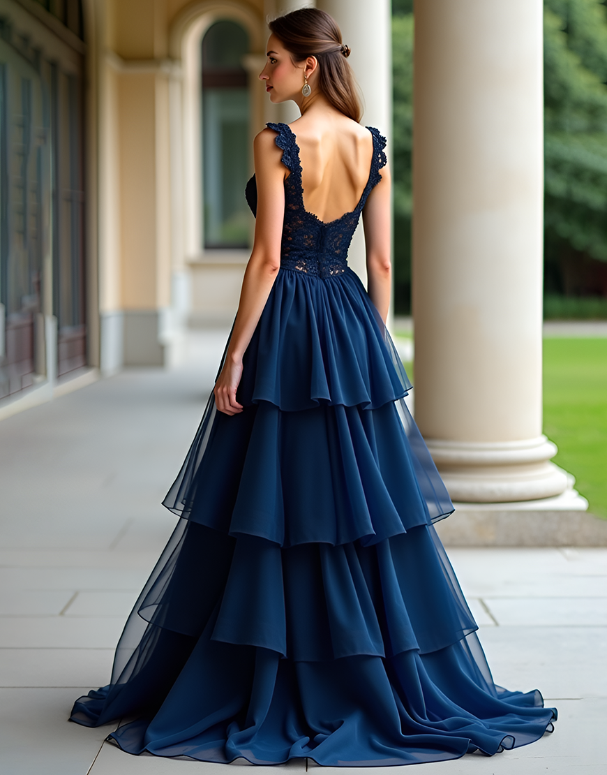 Design: Expertly designed with cascading ruffles and delicate applique, our Navy A-Line Prom Dress exudes elegance and charm. The strapless design and backless detail add a touch of modernity, while the sweeping train creates a stunning silhouette. Perfect for any prom or formal event, this dress is sure to turn heads.