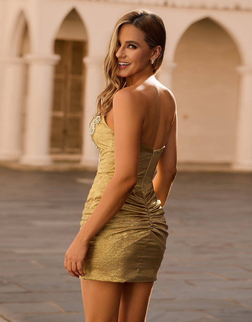Golden Bodycon Strapless Homecoming Dress With Appliques